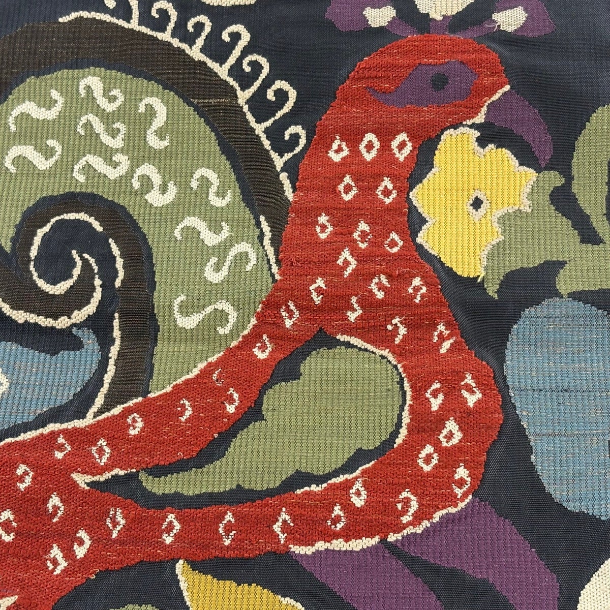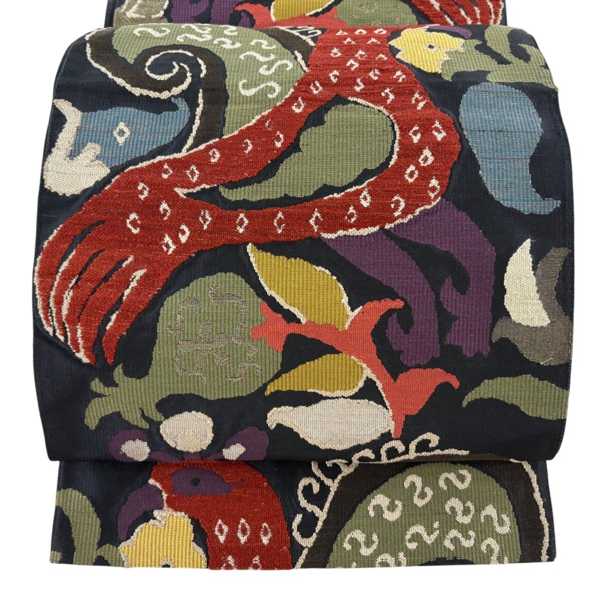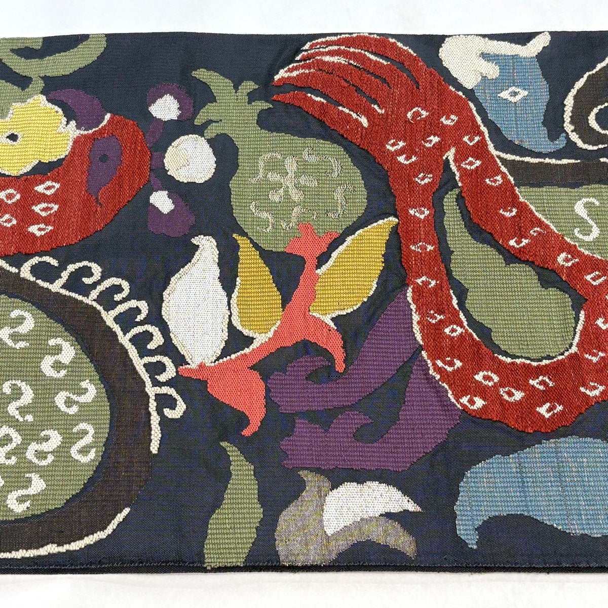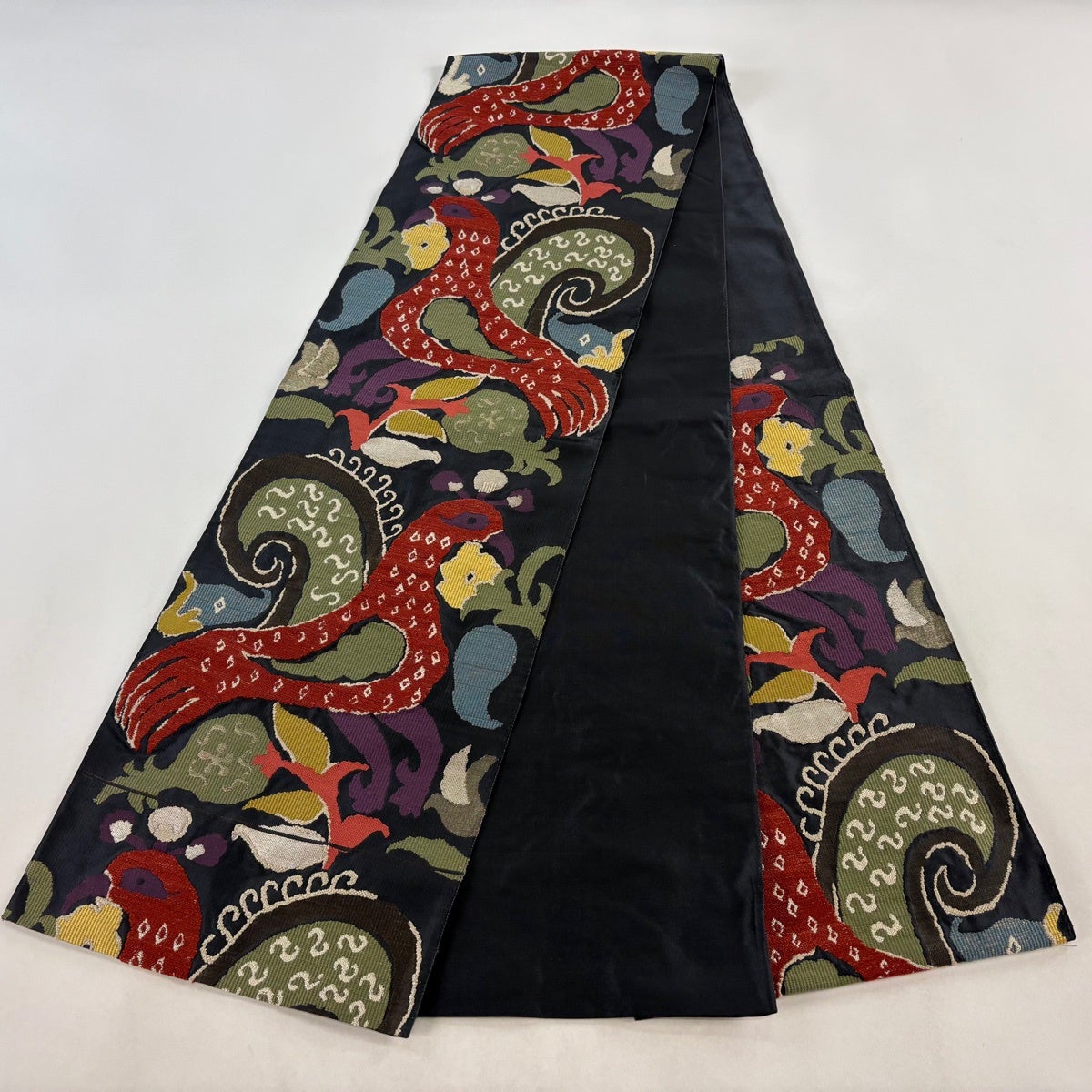 【美品】 開き名古屋帯 名品 龍村美術織物 比翼仕立て 山羊花卉文錦 深緑 正絹