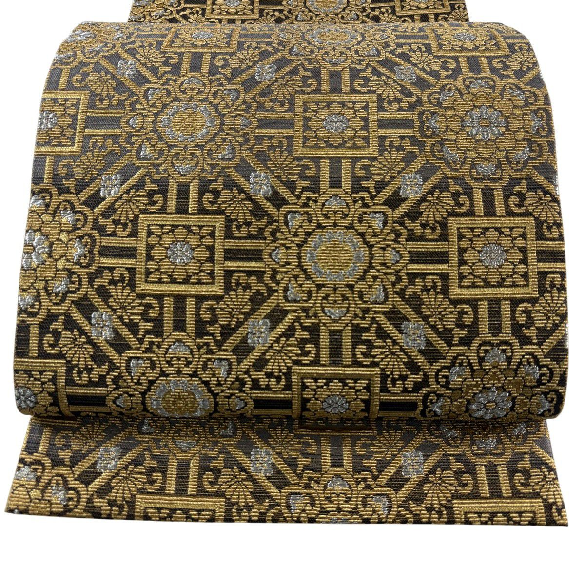 袋帯 名品 華文 草花 金銀糸 箔 黒灰 六通 正絹