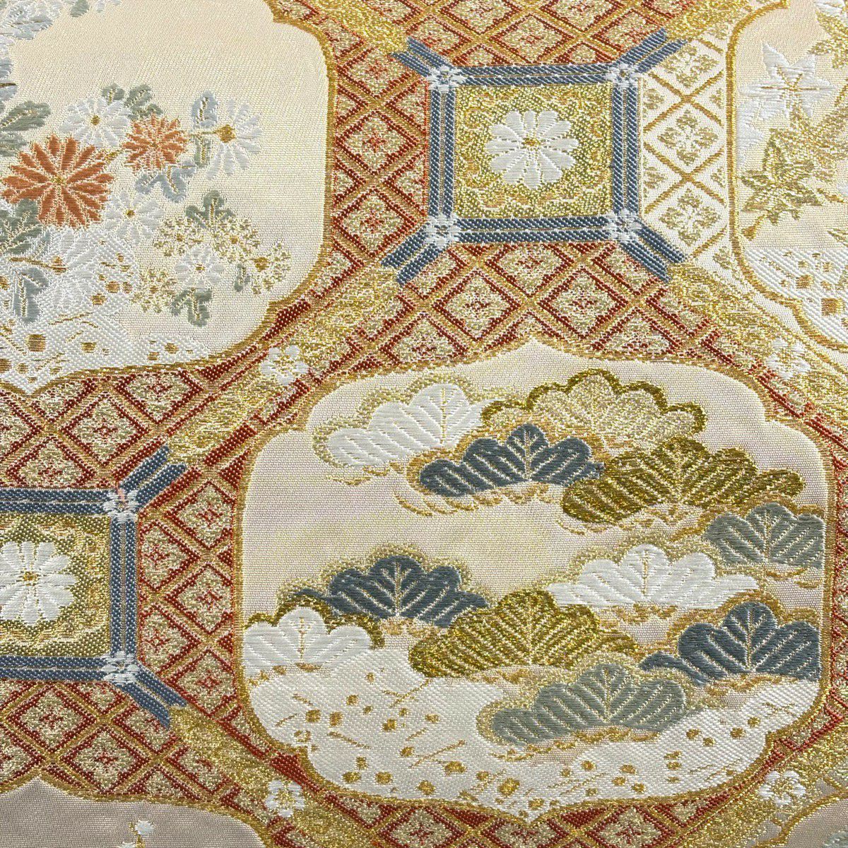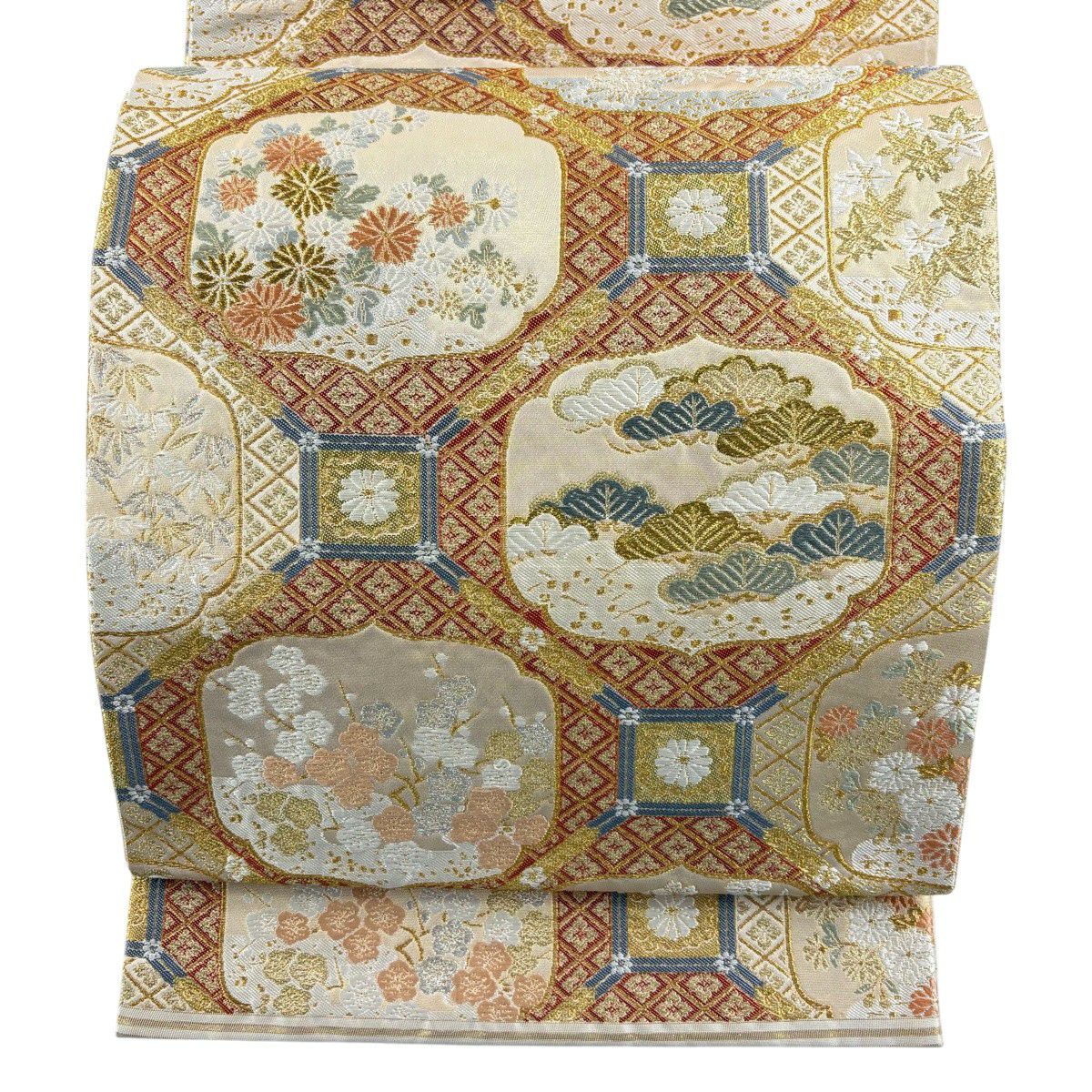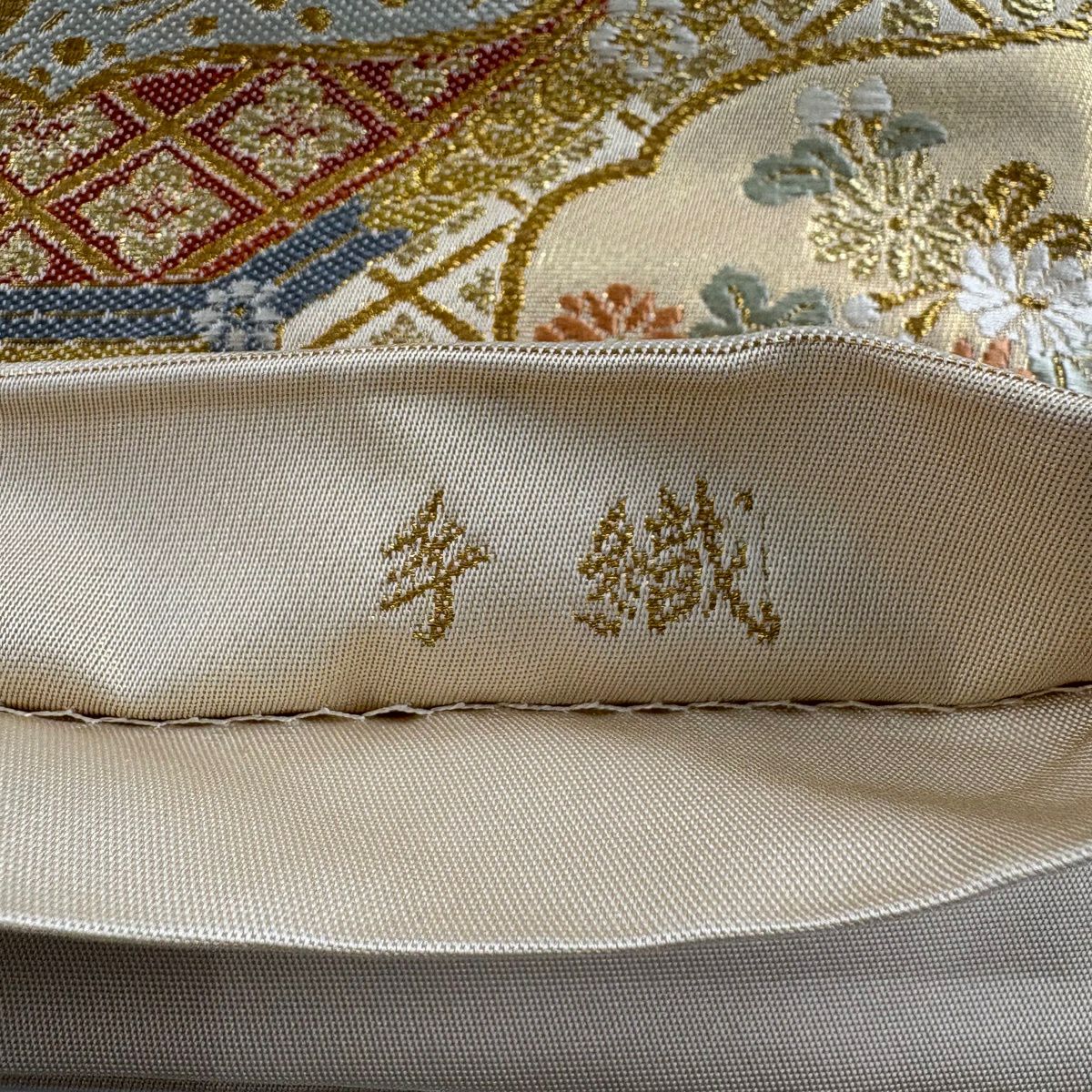 袋帯 秀品 関西仕立て 花丸文 波 金糸 箔 クリーム 六通 正絹