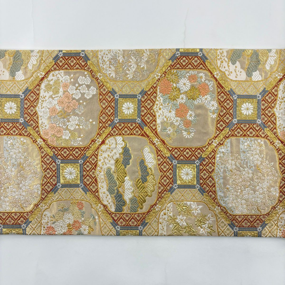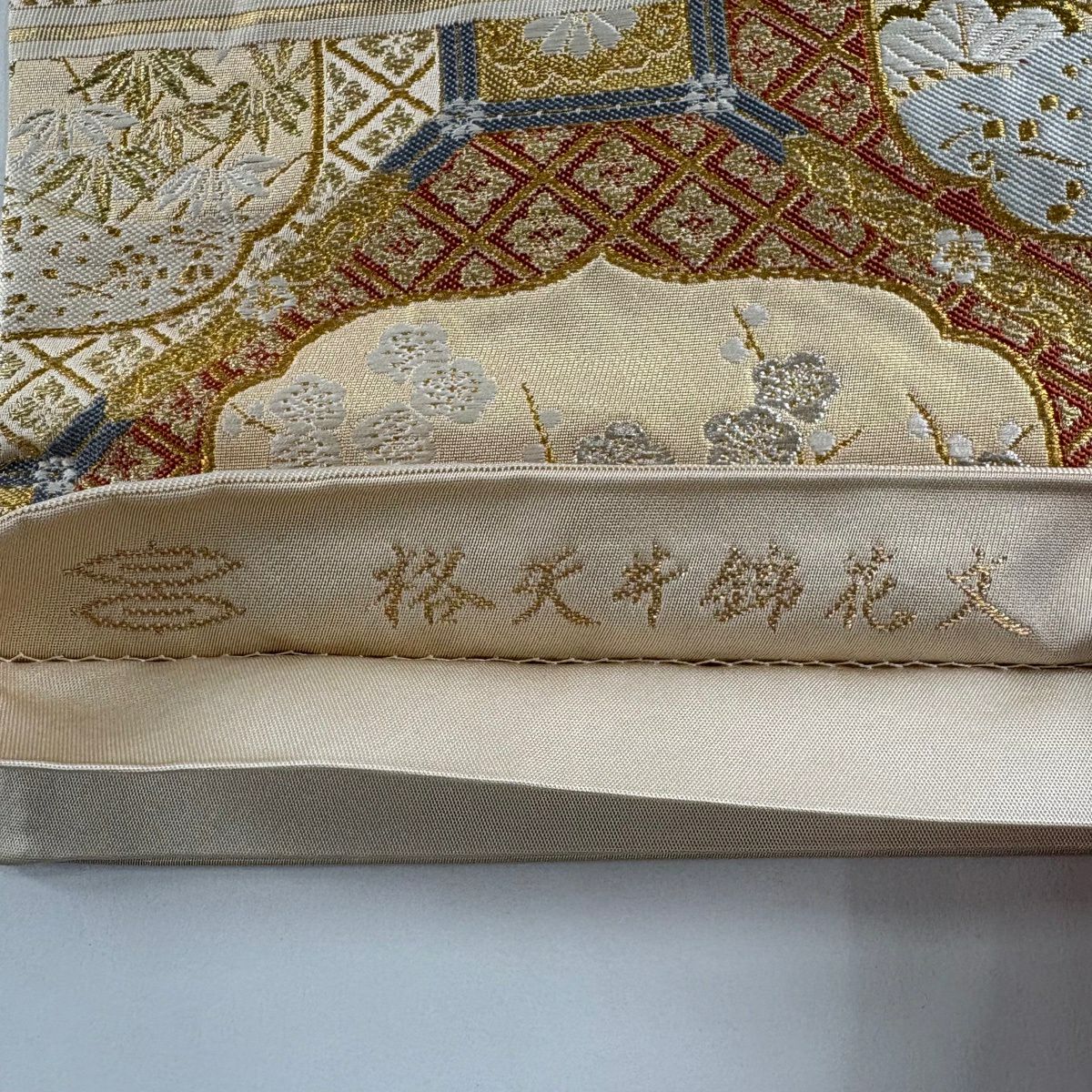 【美品】 袋帯 名品 河村織物 落款あり 関西仕立て 格天井錦花文 金銀糸 箔 金色 六通 正絹