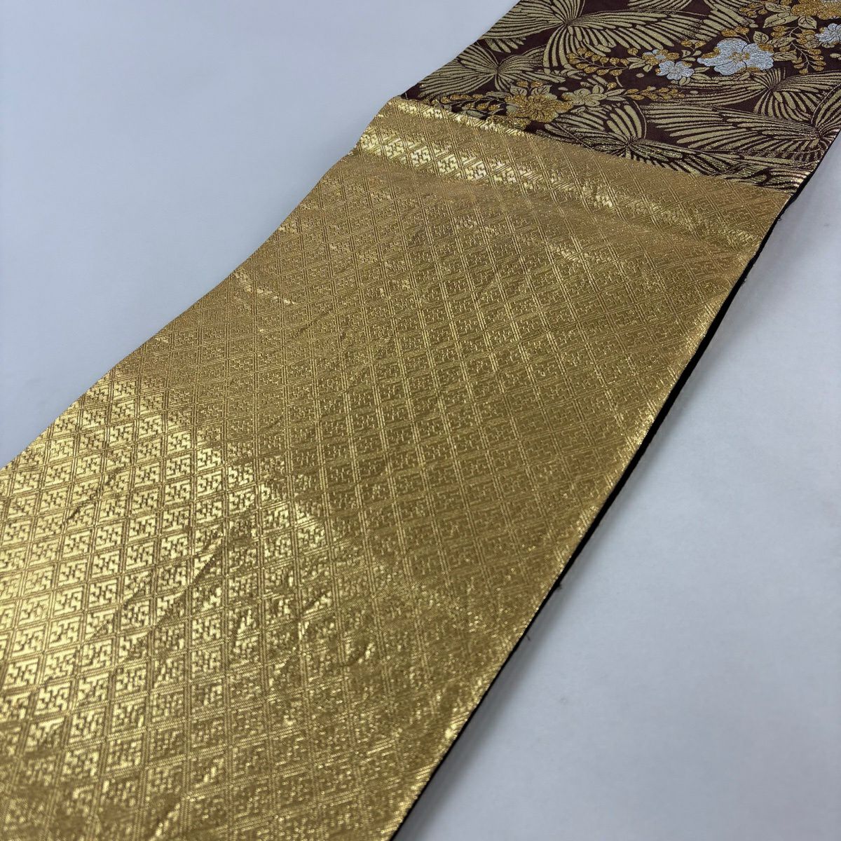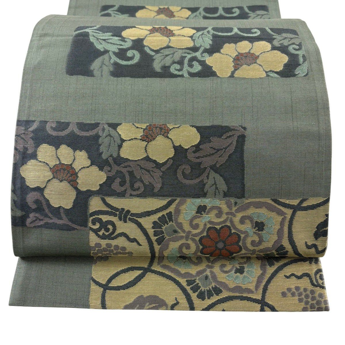 袋帯 秀品 七宝 花唐草 金糸 箔 灰茶 六通 正絹