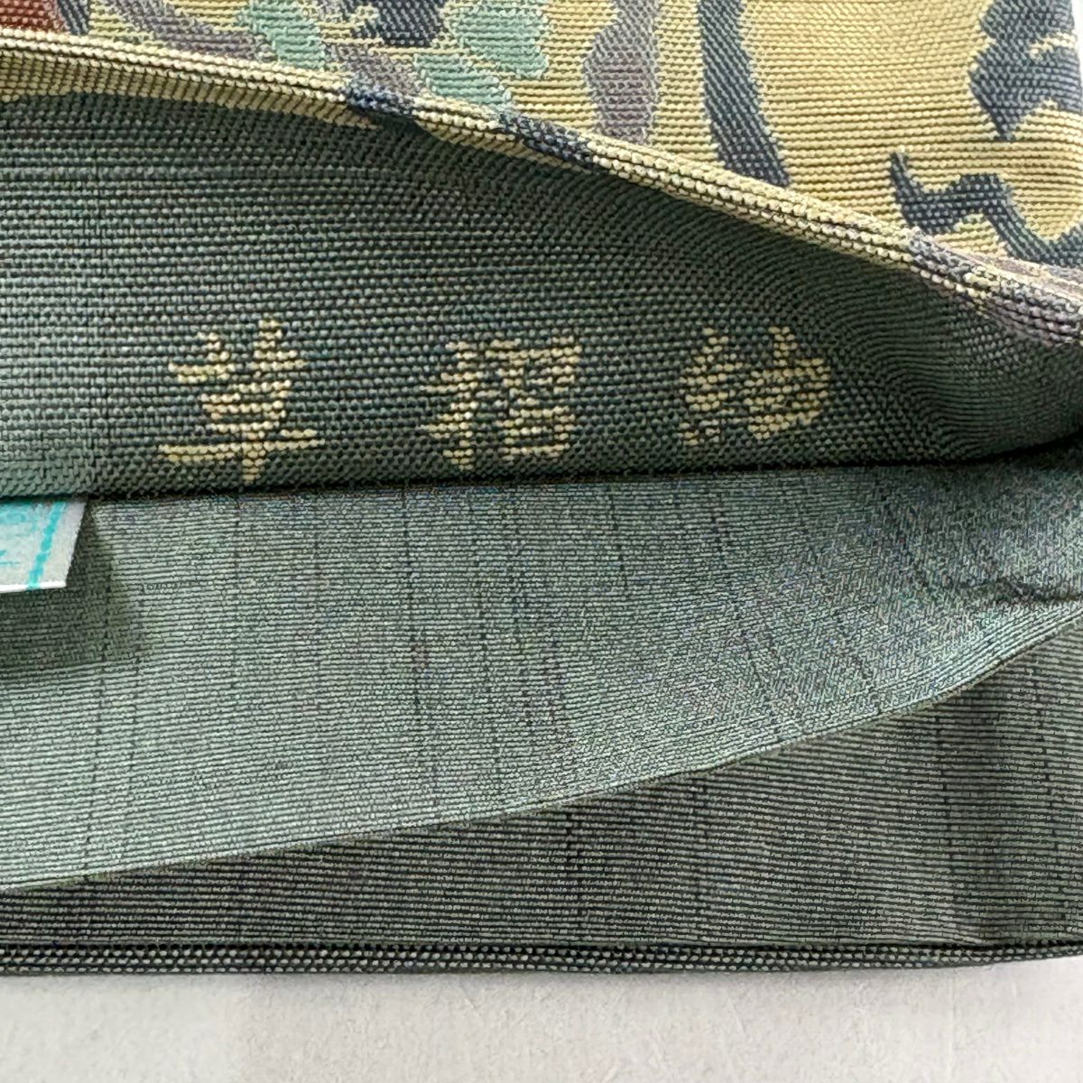 【美品】 袋帯 名品 落款あり 建物 樹木 螺鈿 金彩 灰緑 お太鼓柄 正絹