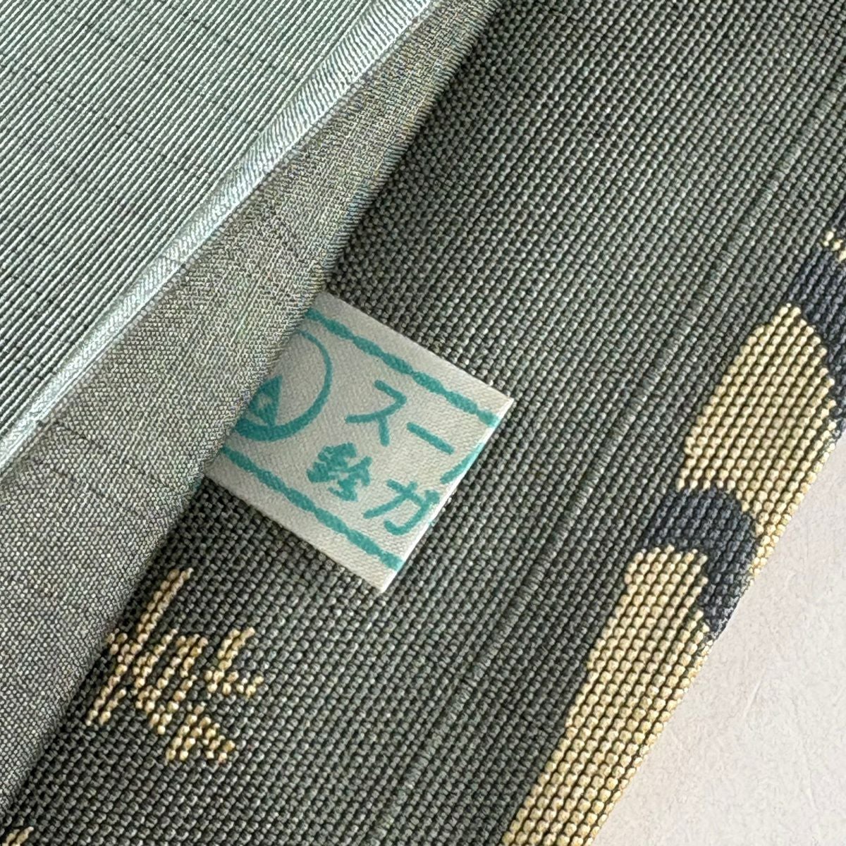 袋帯 秀品 落款あり 草花 向い鳥 箔 銀通し 灰緑 お太鼓柄 正絹