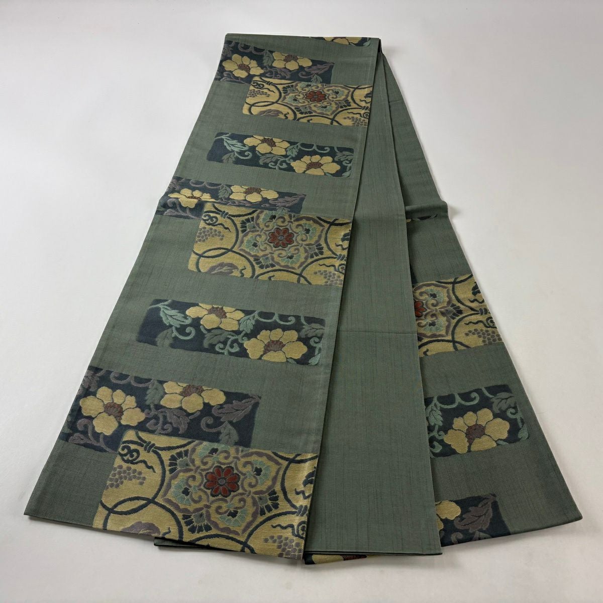 袋帯 秀品 綾織 草花 金糸 箔 深緑 六通 正絹