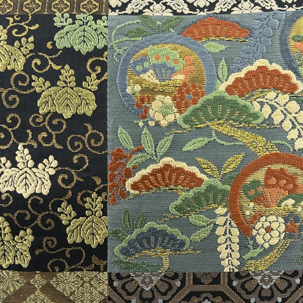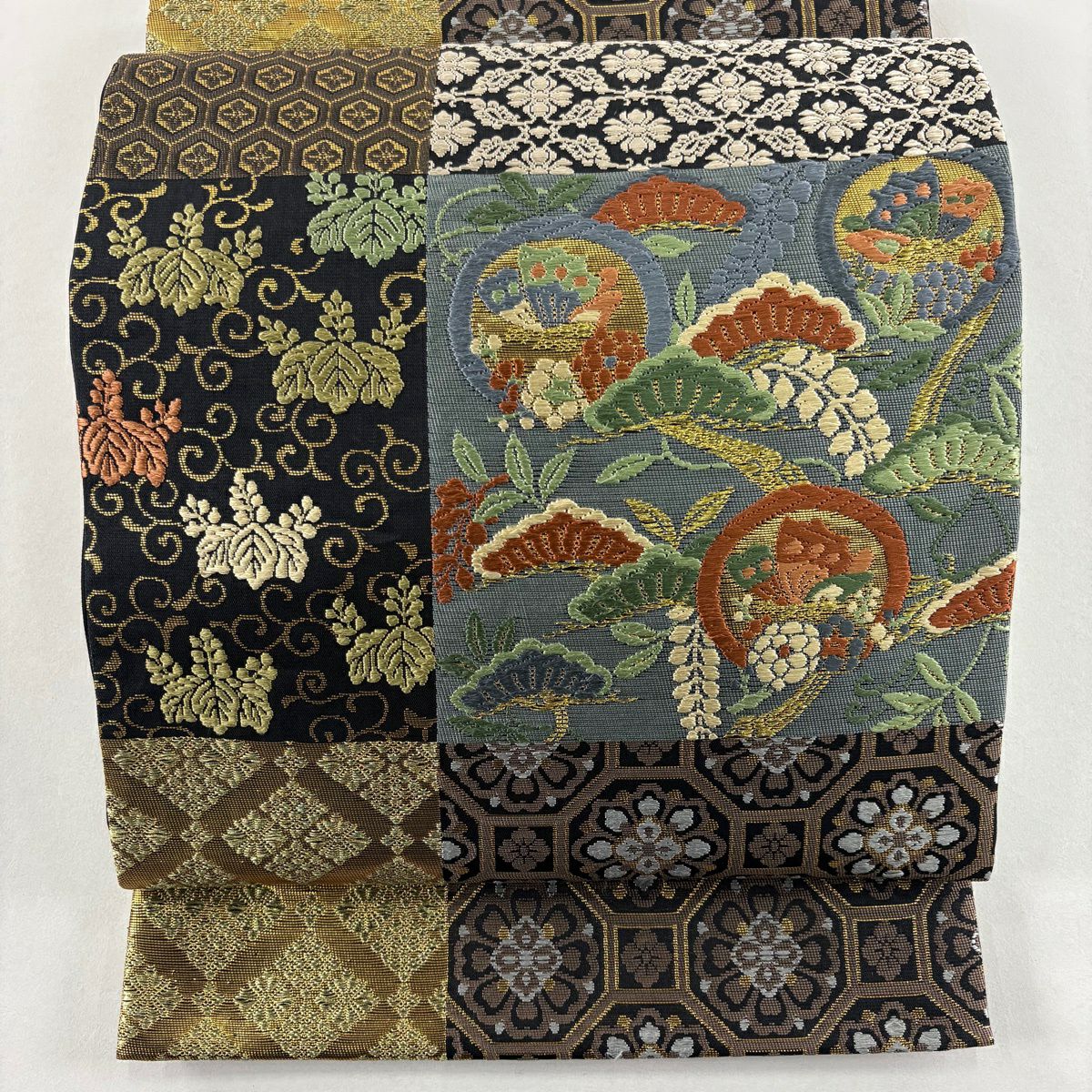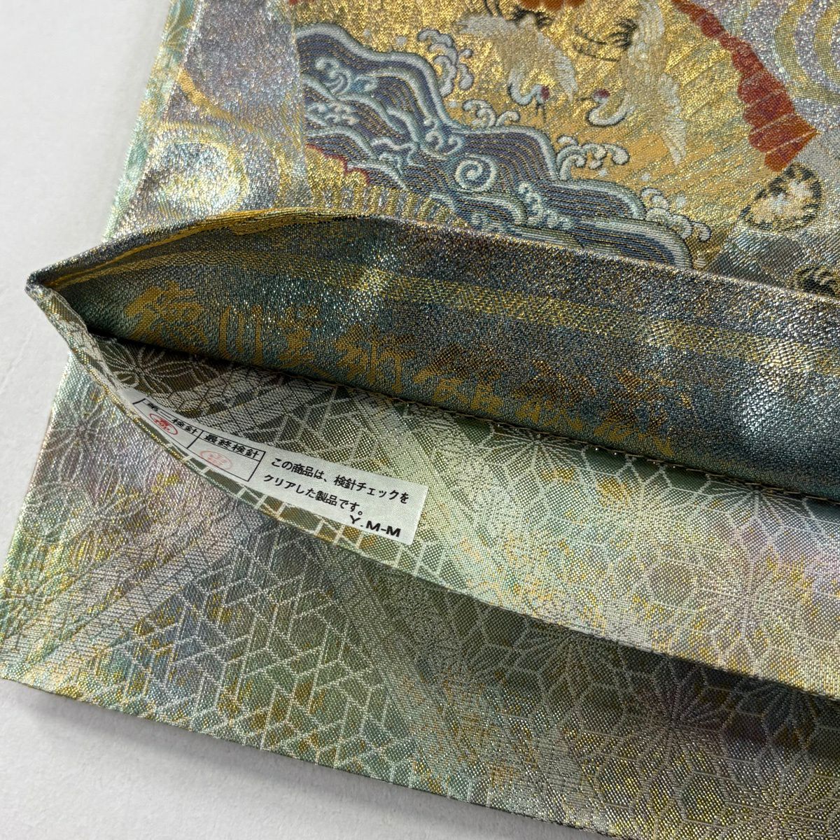 【美品】 袋帯 名品 箔屋清兵衛 落款あり 悠久の美 名物裂文様 華文 箔 茶緑色 お太鼓柄 正絹
