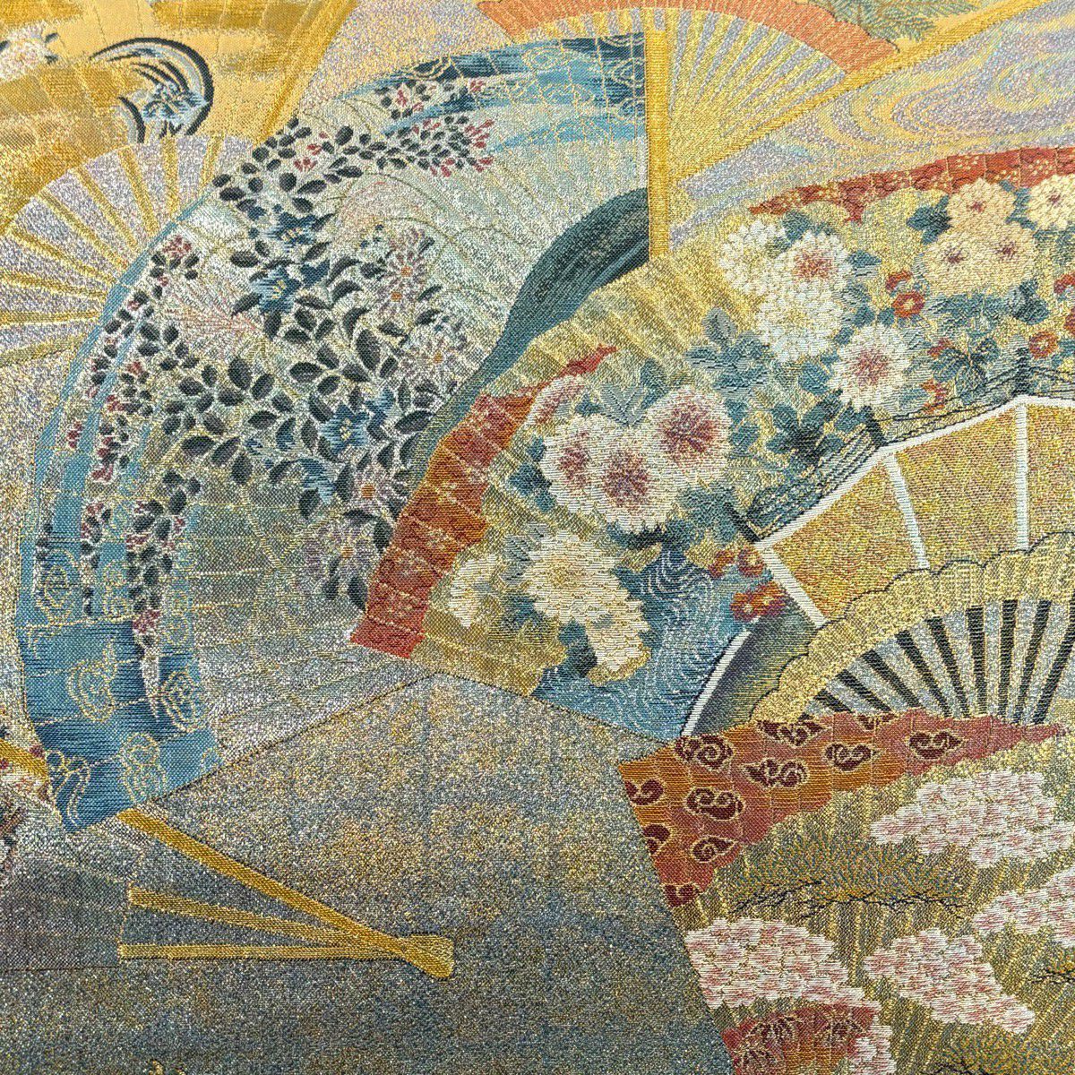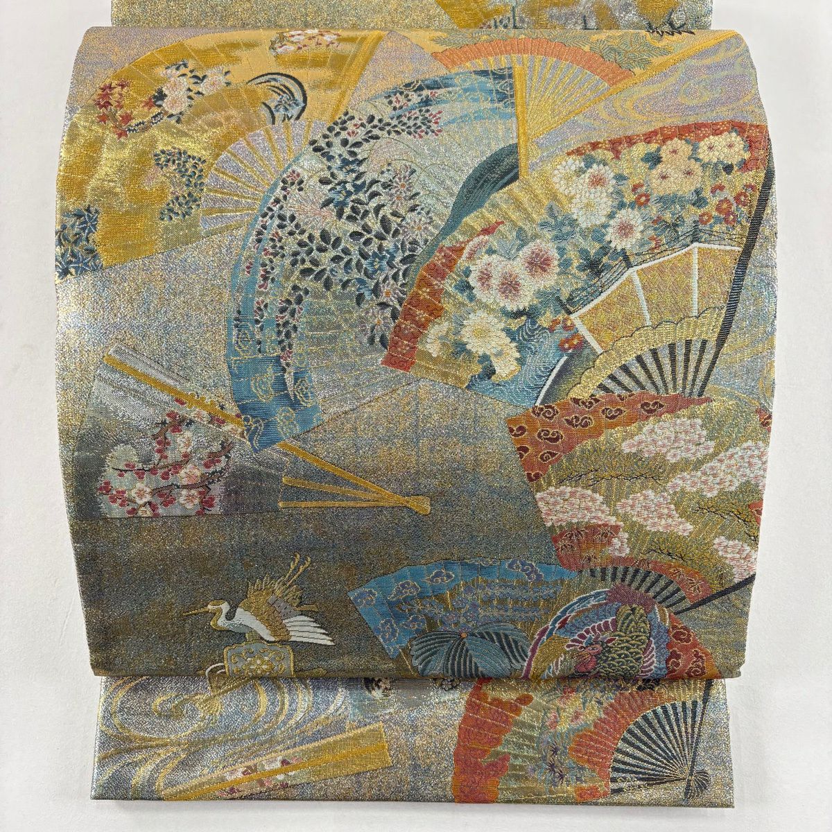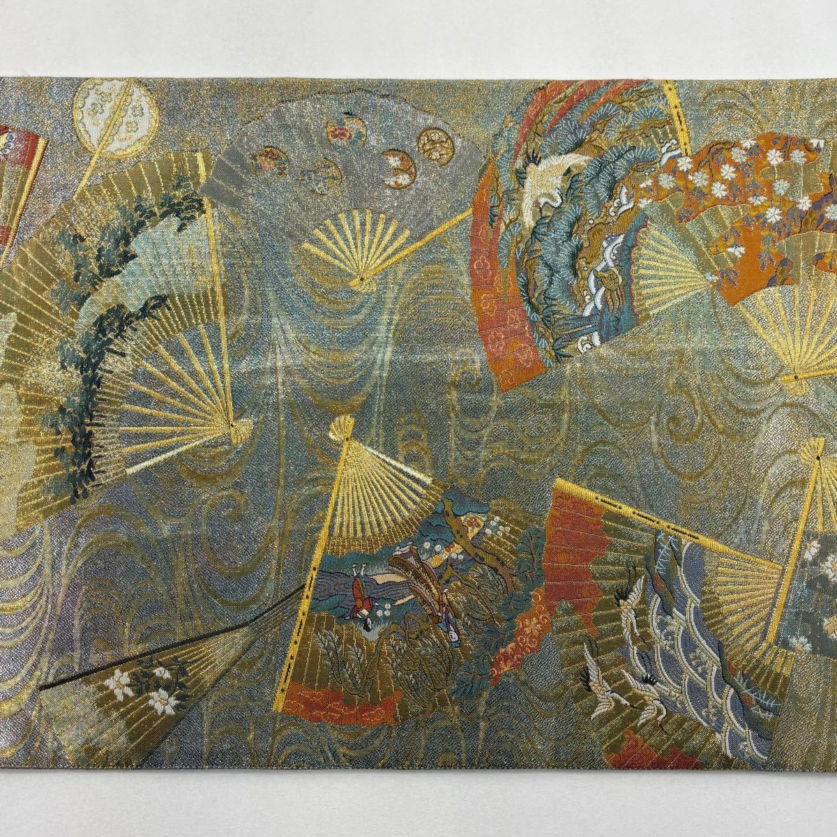 【美品】 袋帯 名品 落款あり 徳川美術館秘蔵 扇 花鳥 金糸 箔 金色 お太鼓柄 正絹
