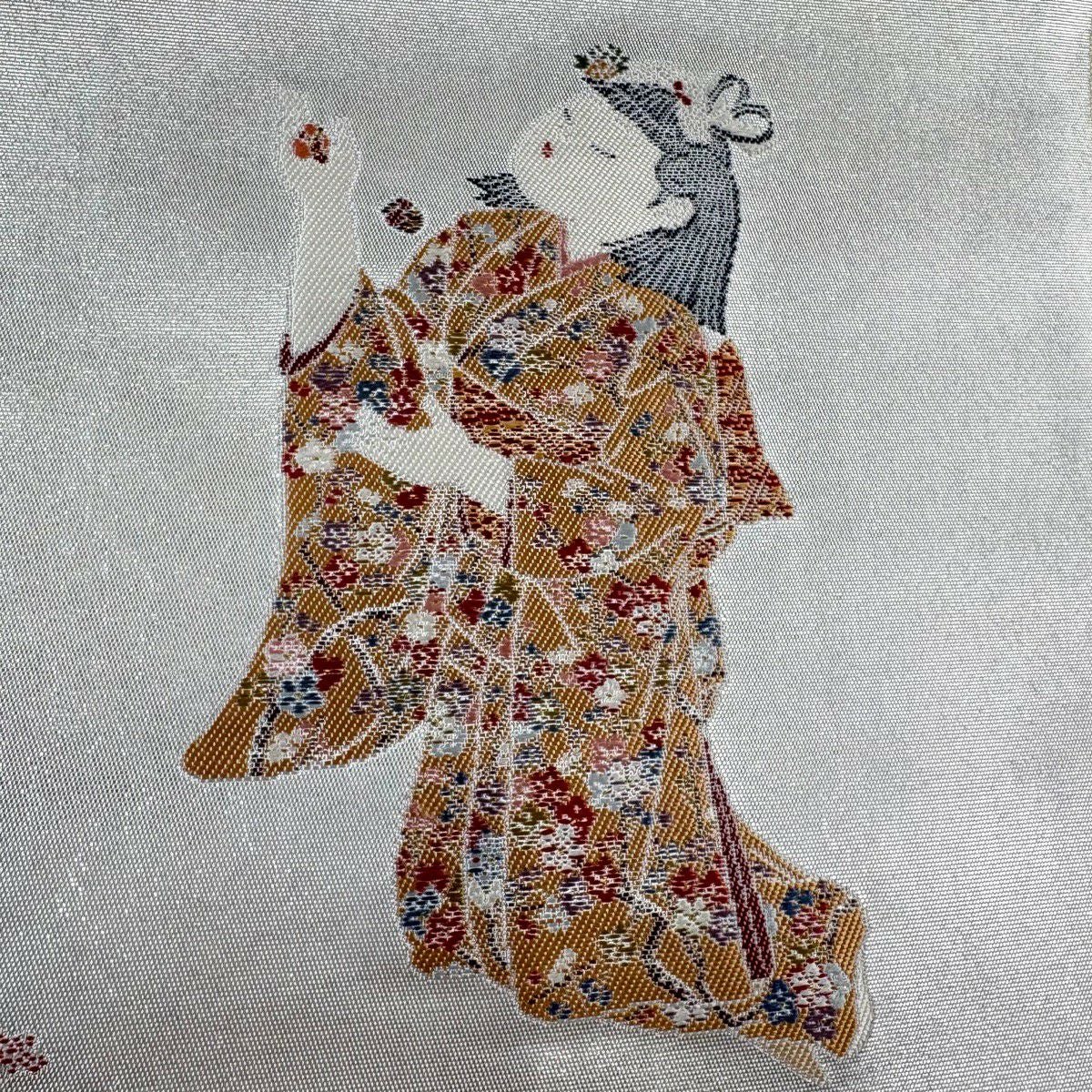 袋帯 名品 河合美術織物 落款あり 関西仕立て 牡丹 花器 箔 唐織 薄緑 六通 正絹