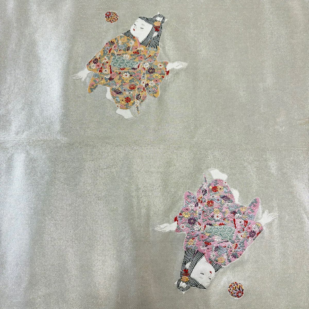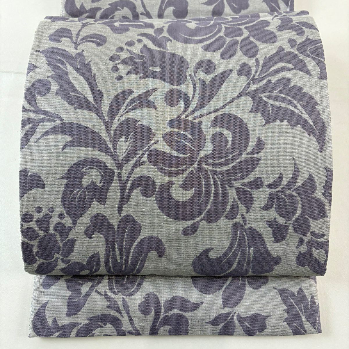 【美品】 袋帯 秀品 花唐草 青海波 箔 灰色 六通 正絹