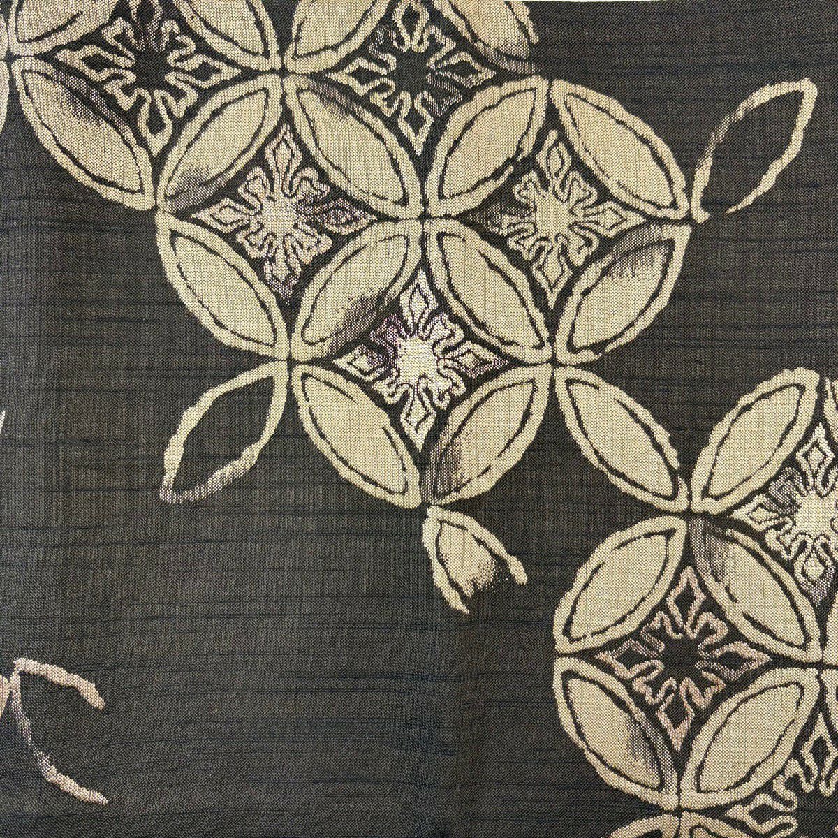 名古屋帯 逸品 城間栄喜 落款あり 琉球紅型 紬地 椿 雲文 ベージュ 正絹