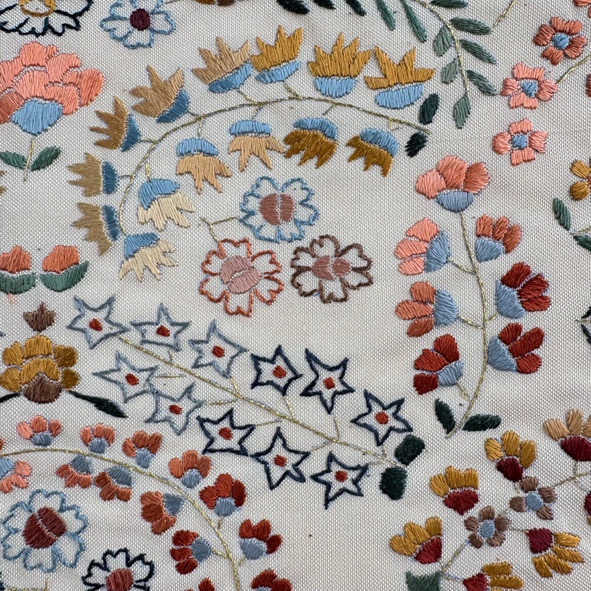 袋帯 名品 花唐草 器物 刺繍 金銀糸 ベージュ お太鼓柄 正絹