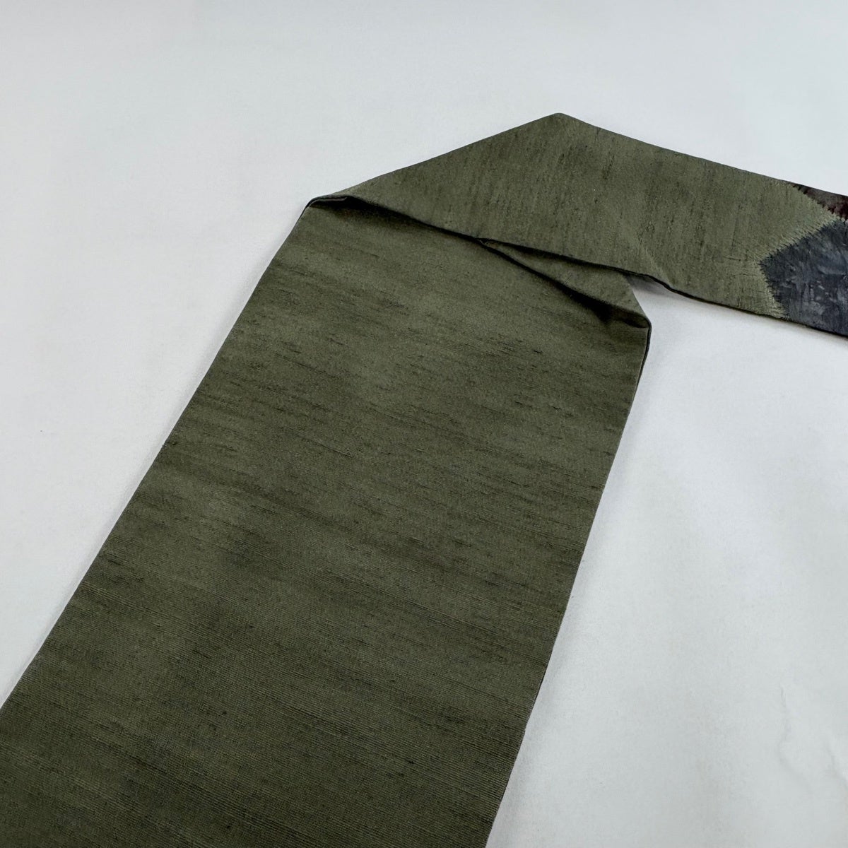 袋帯 名品 野菜 縞 紬地 深緑 お太鼓柄 正絹