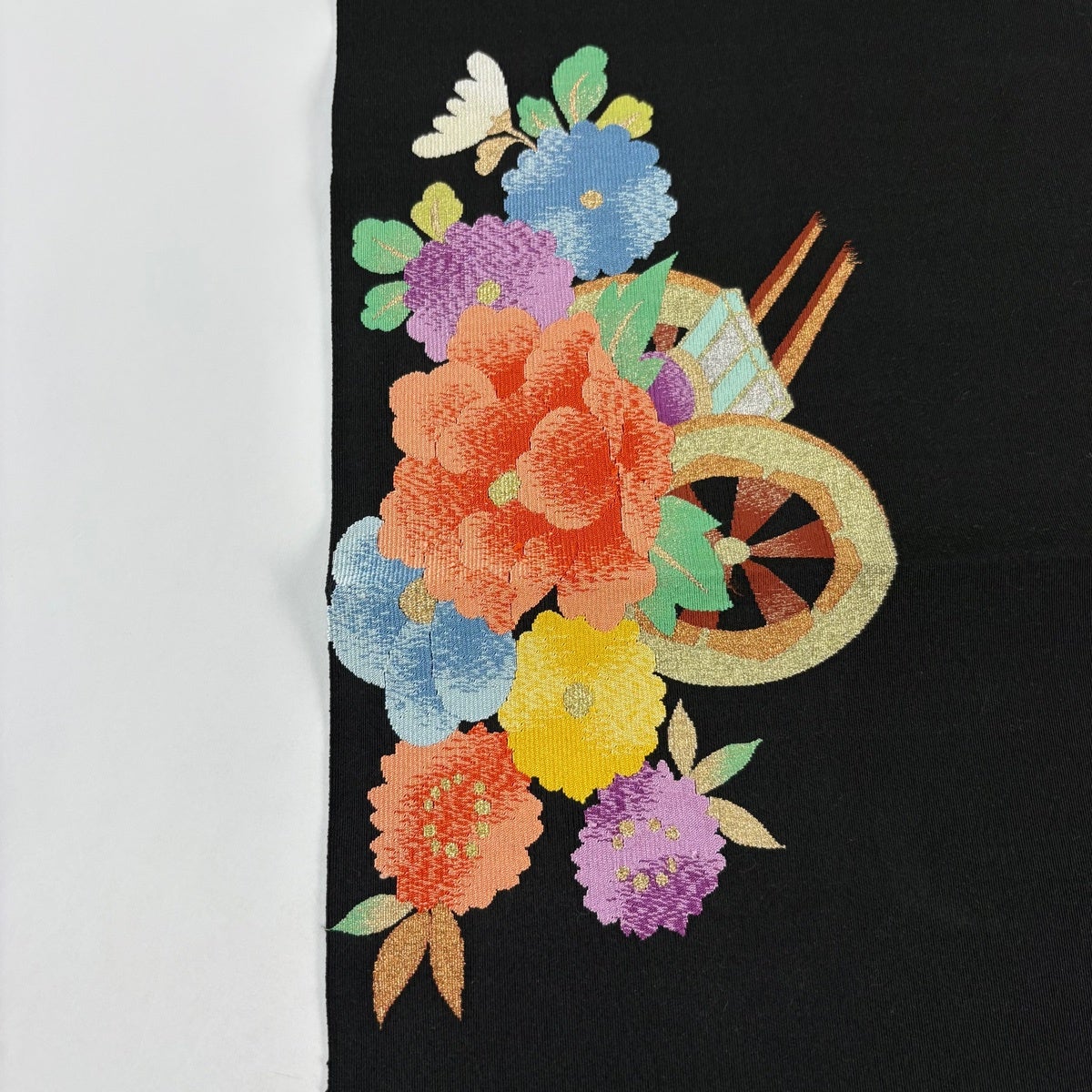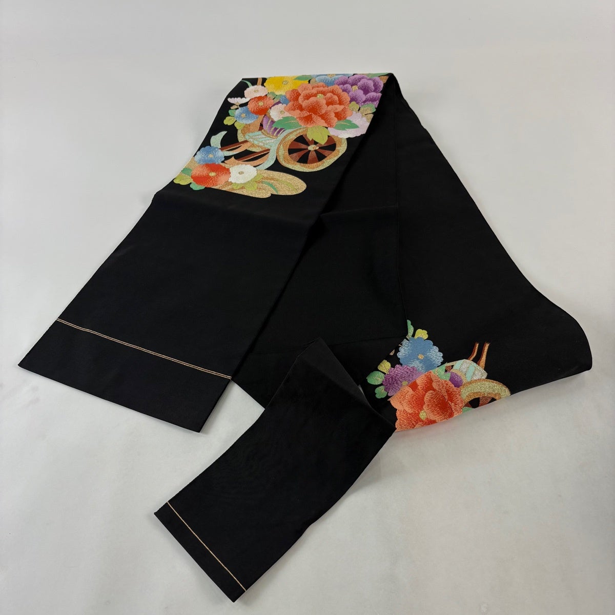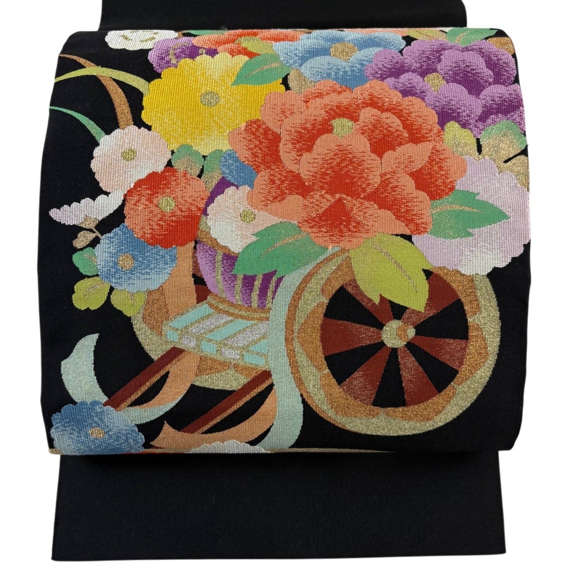 名古屋帯 秀品 八寸名古屋帯 松葉仕立て 花車 霞 金銀糸 黒 正絹