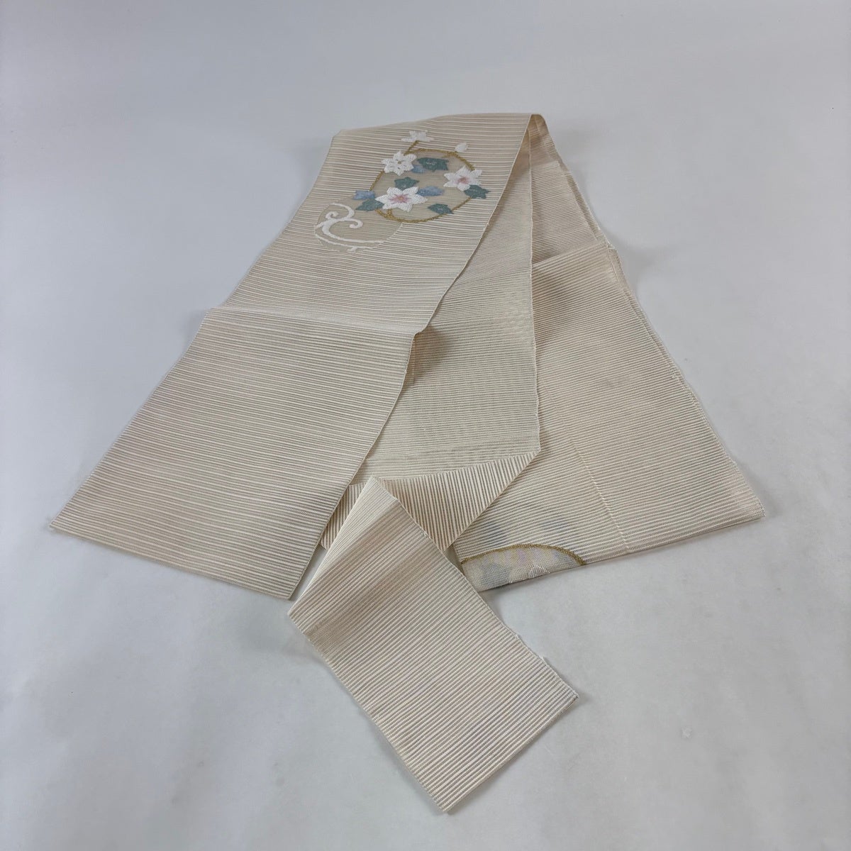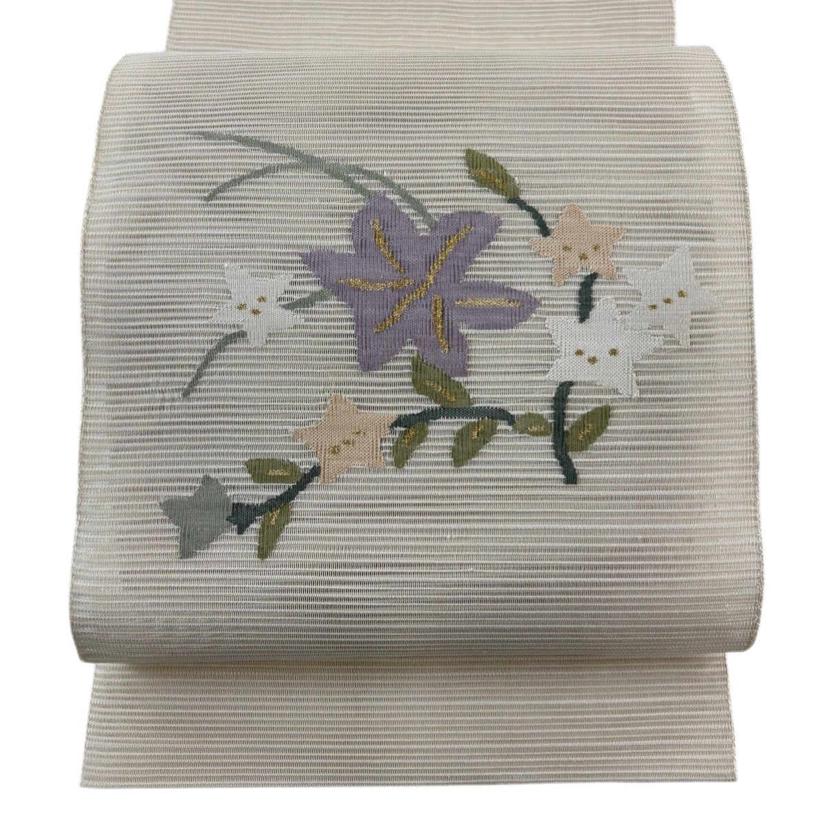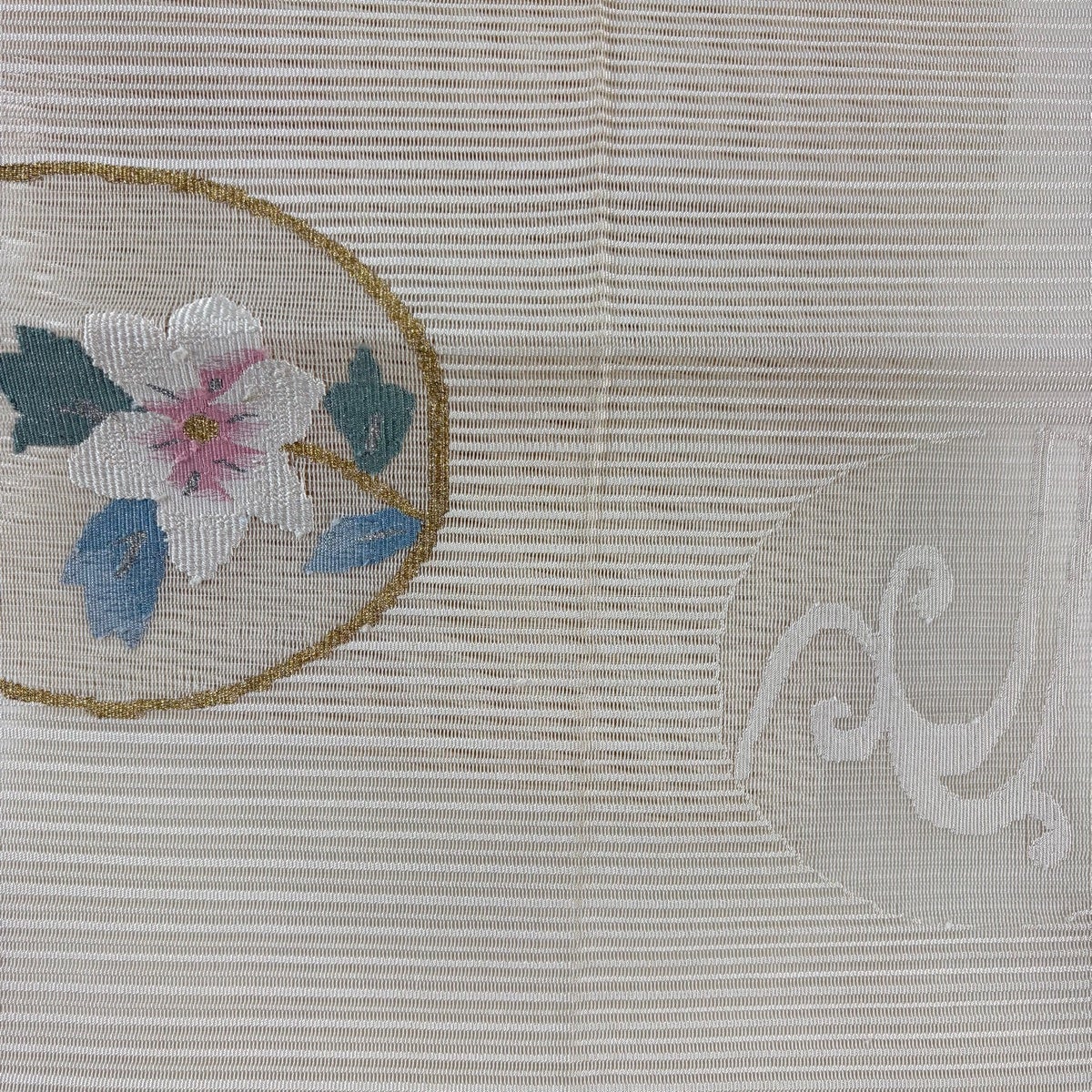 袋帯 秀品 扇面 草花 箔 螺鈿箔 クリーム 六通 正絹