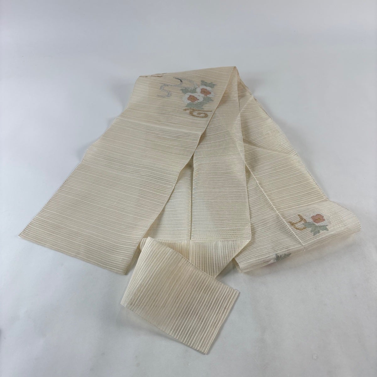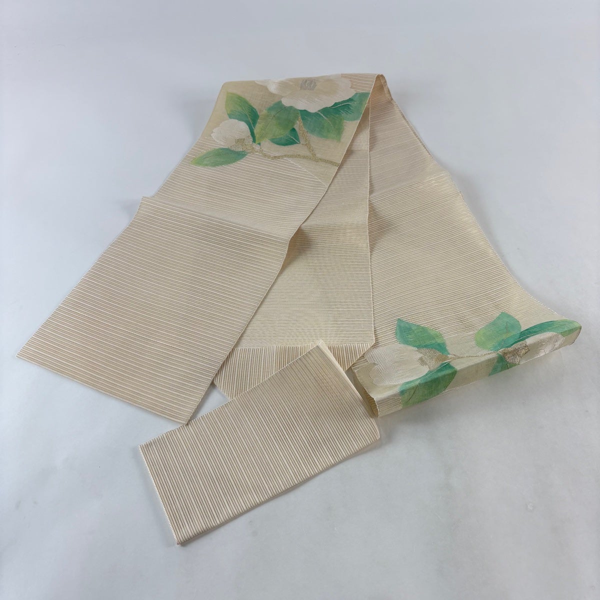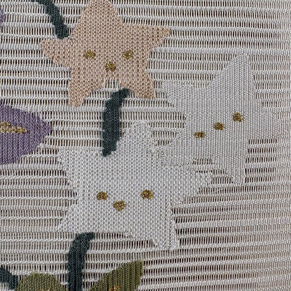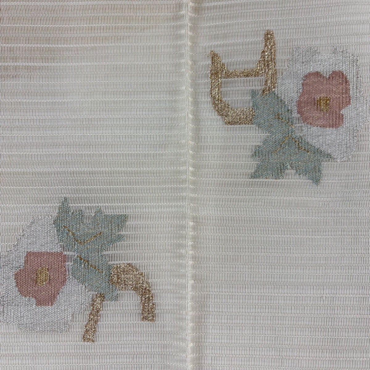 袋帯 秀品 扇面 草花 箔 螺鈿箔 クリーム 六通 正絹