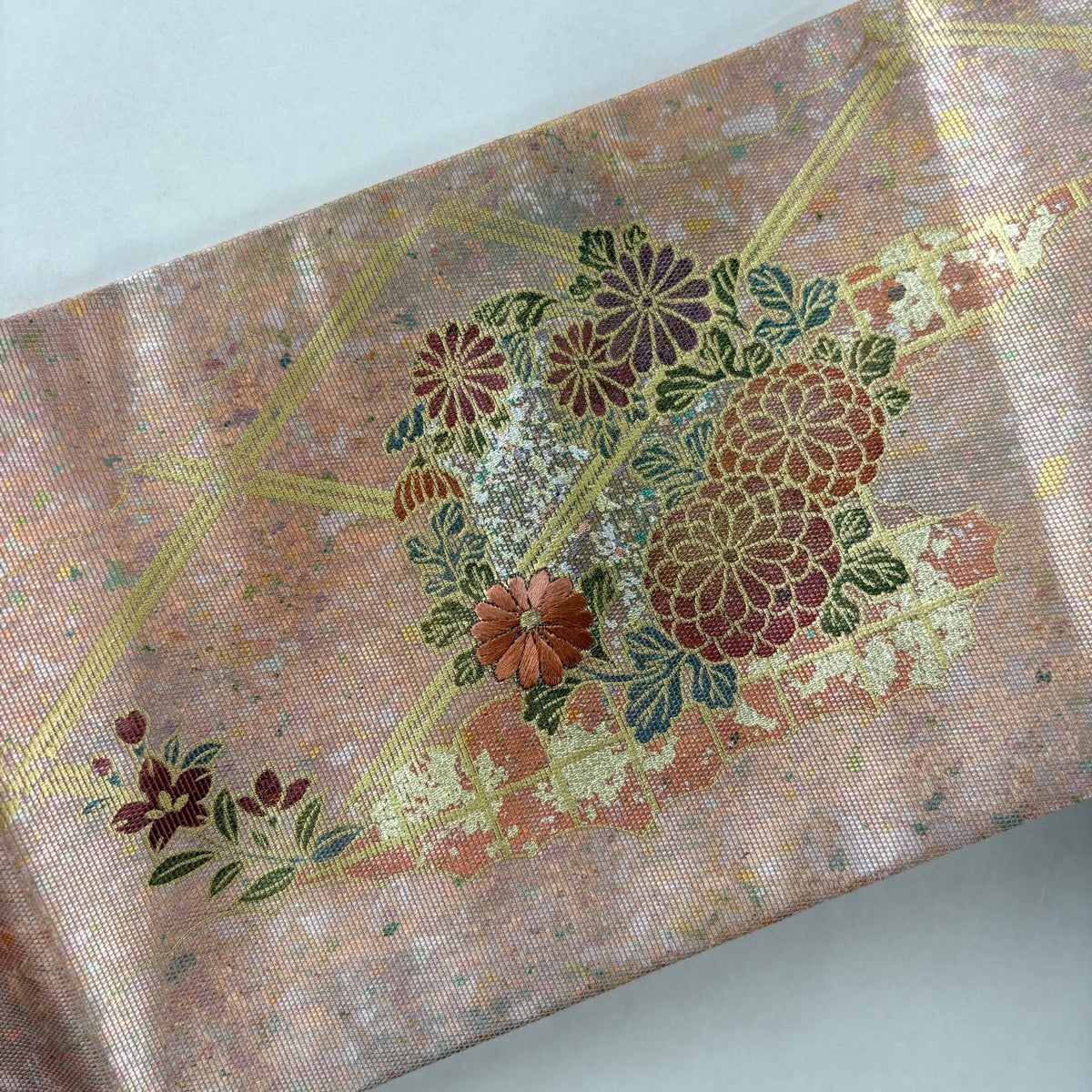 袋帯 秀品 ワンポイント柄 花 流水 金銀彩 箔 金茶 六通 正絹