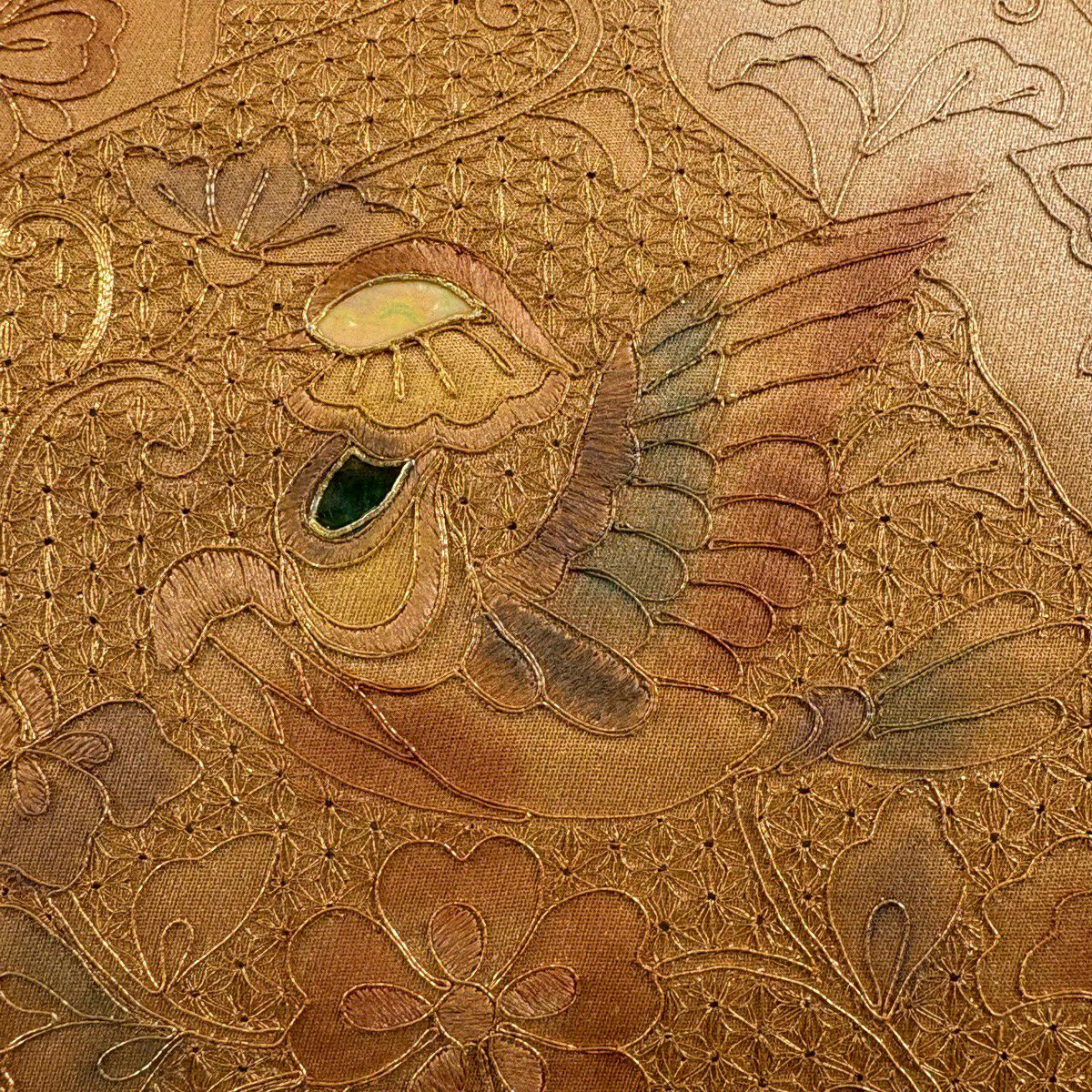 【美品】 袋帯 秀品 屏貼花鳥紋 古銘錦箔 金銀糸 金色 六通 正絹