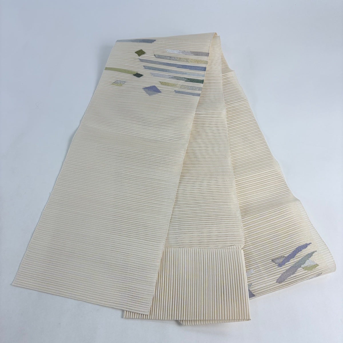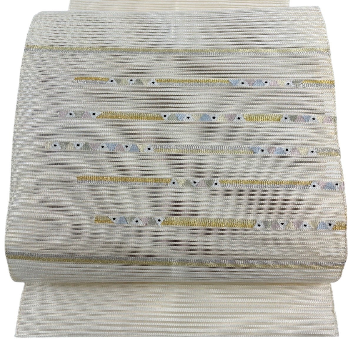 名古屋帯 秀品 松葉仕立て 八寸名古屋帯 夏帯 絽 縞 幾何学 金銀糸 ベージュ 正絹