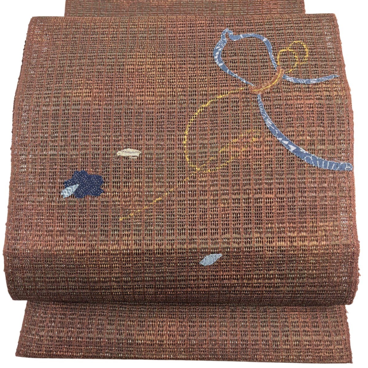 【美品】 袋帯 秀品 夏帯 関西仕立て 絽 葉柄 波頭 金銀糸 刺繍 薄茶色 お太鼓柄 正絹