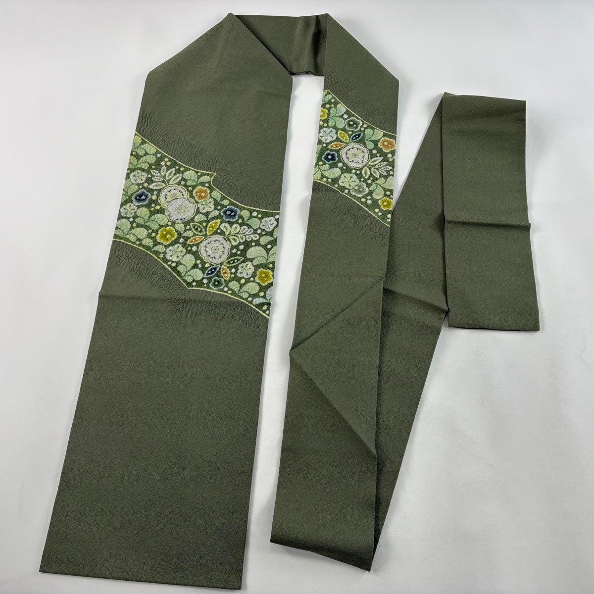 【美品】 名古屋帯 名品 草花 絞り 灰緑 正絹