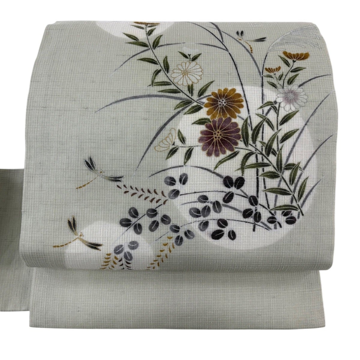 【美品】 名古屋帯 名品 夏帯 夏紬地 秋草 とんぼ 金銀彩 灰緑 正絹