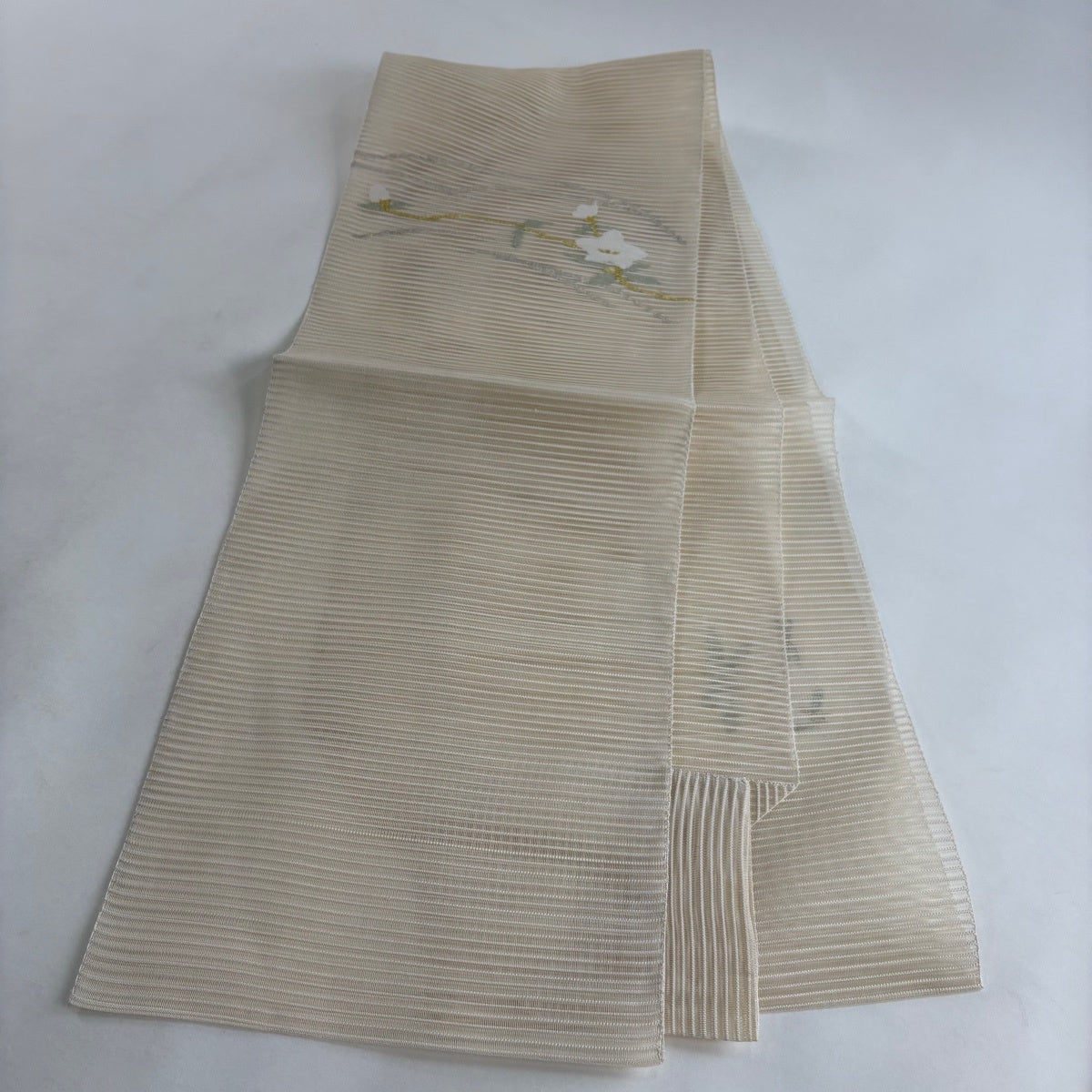 【美品】 名古屋帯 名品 落款あり 夏帯 夏紬地 百合 薄茶色 麻