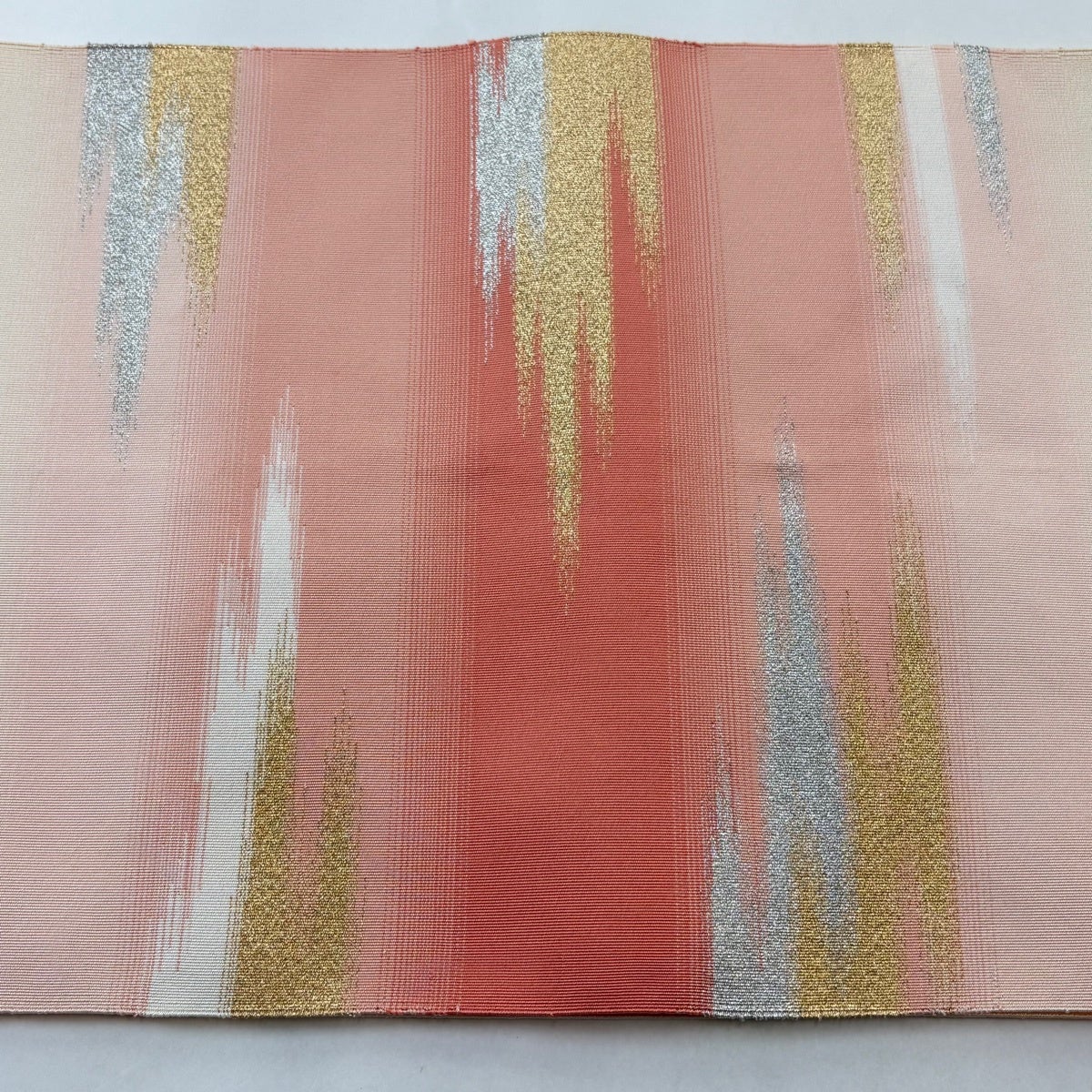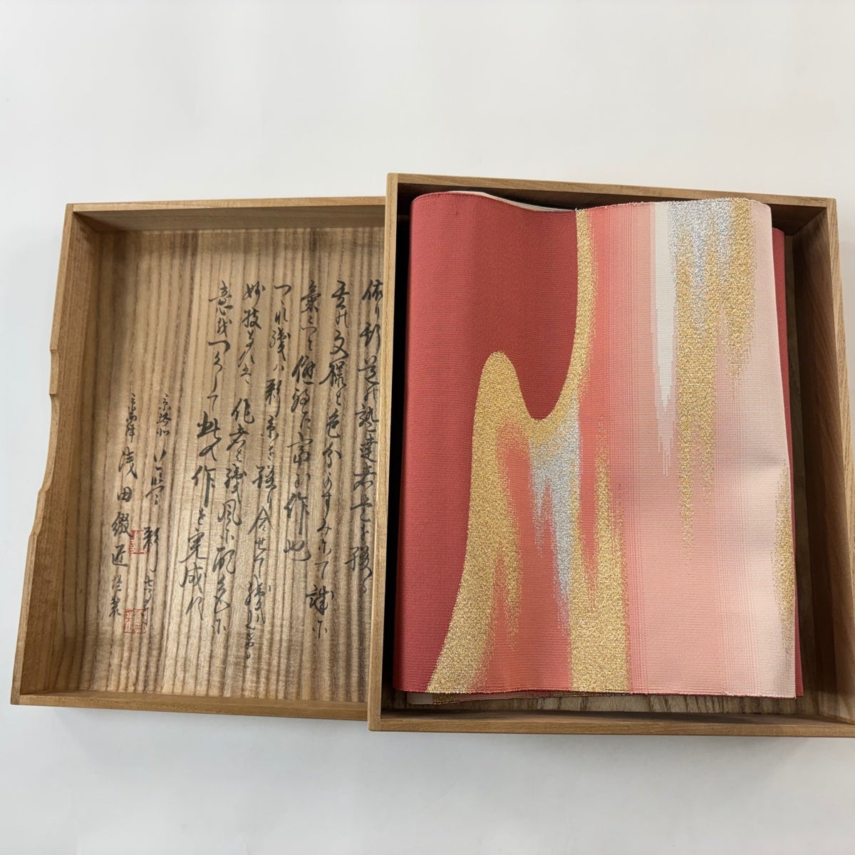 名古屋帯 逸品 浅田綴 八寸名古屋帯 松葉仕立て 共箱付き 霞 金銀糸 薄オレンジ 正絹