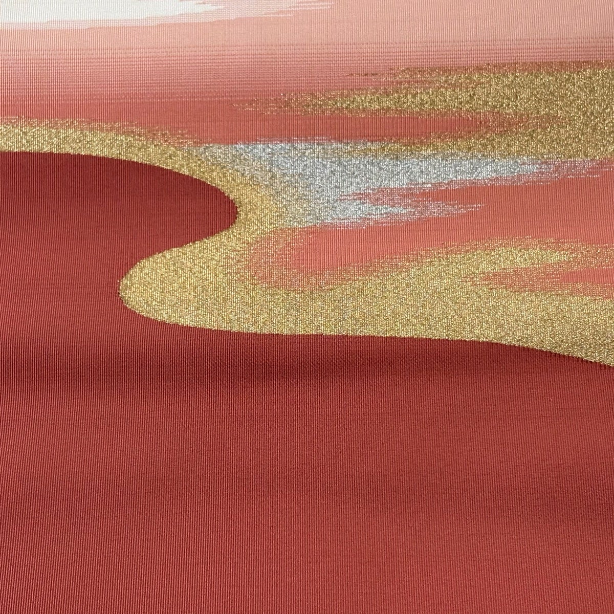 【美品】 袋帯 逸品 渡文 落款あり リバーシブル 霞 幾何学 金糸 箔 山吹茶色 お太鼓柄 正絹