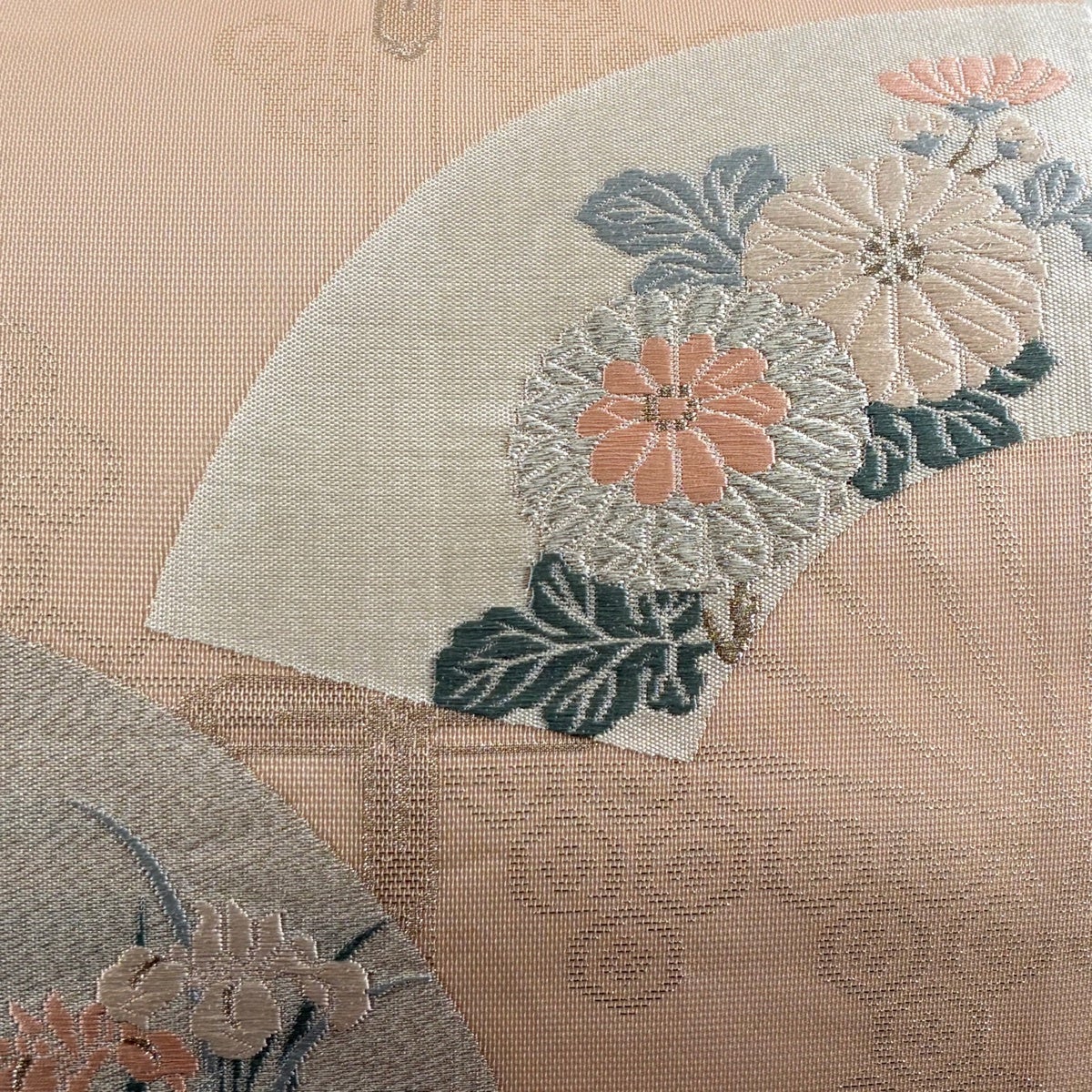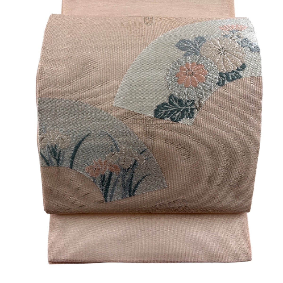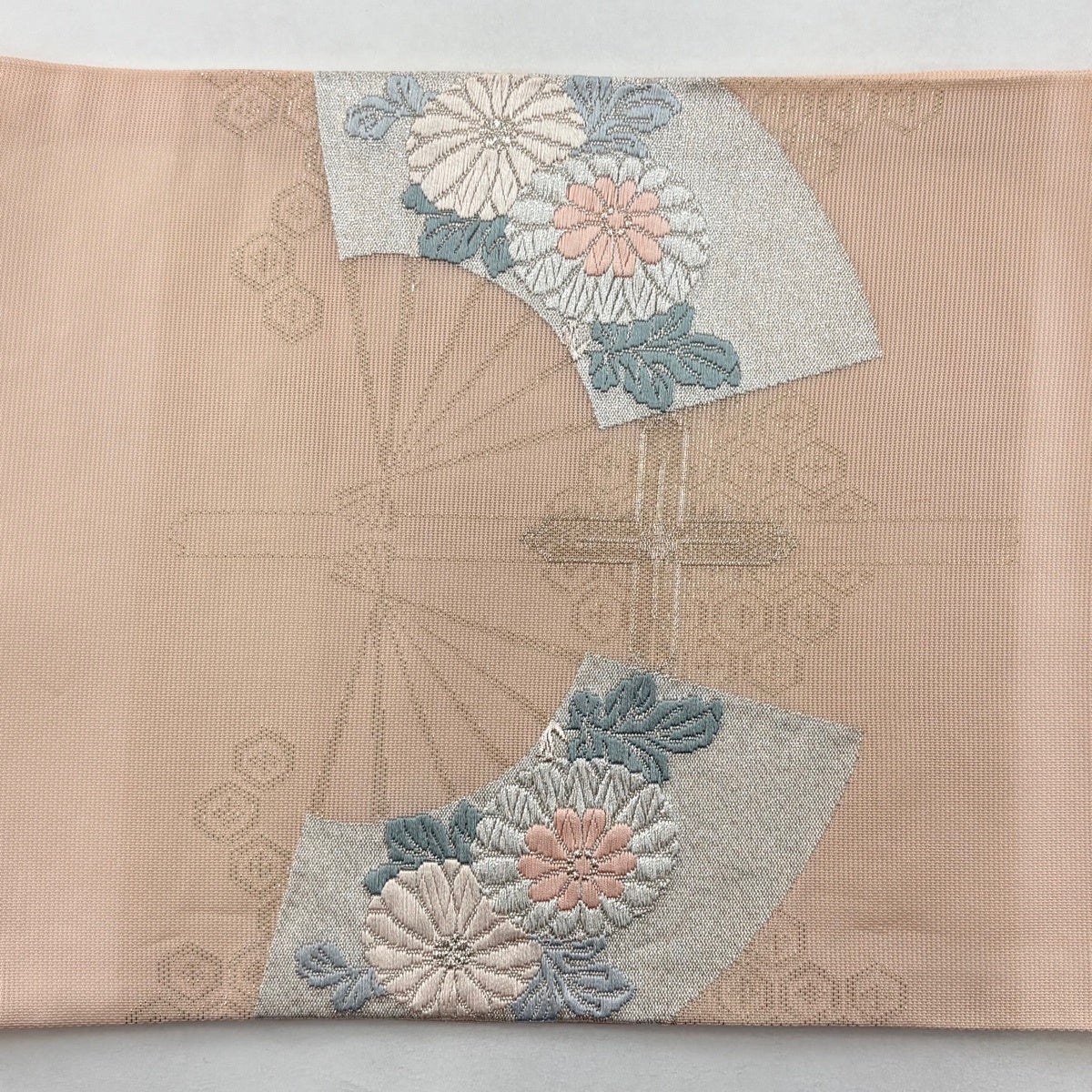 【美品】 開き名古屋帯 優品 夏帯 扇 草花 銀糸 箔 ピンクベージュ 正絹