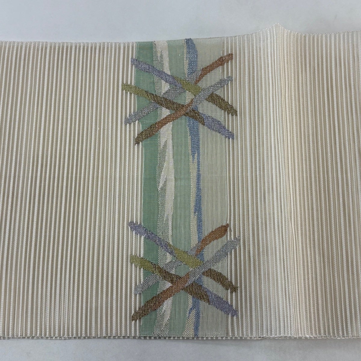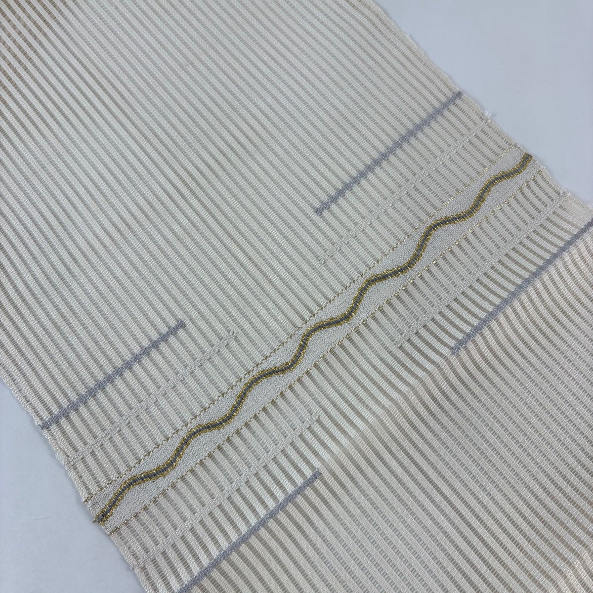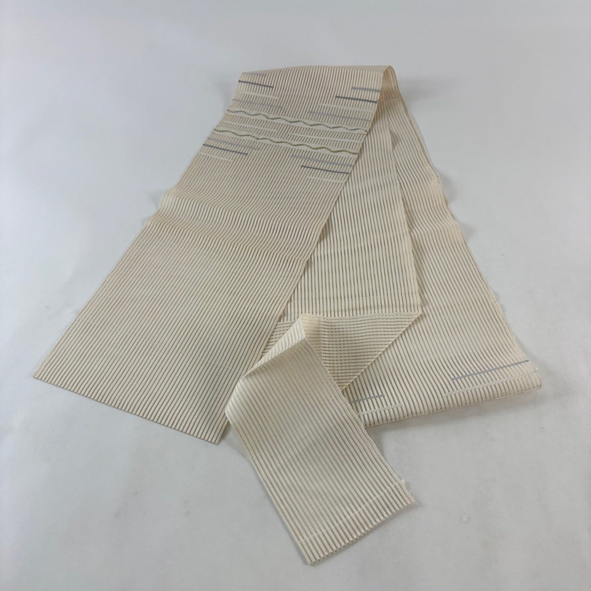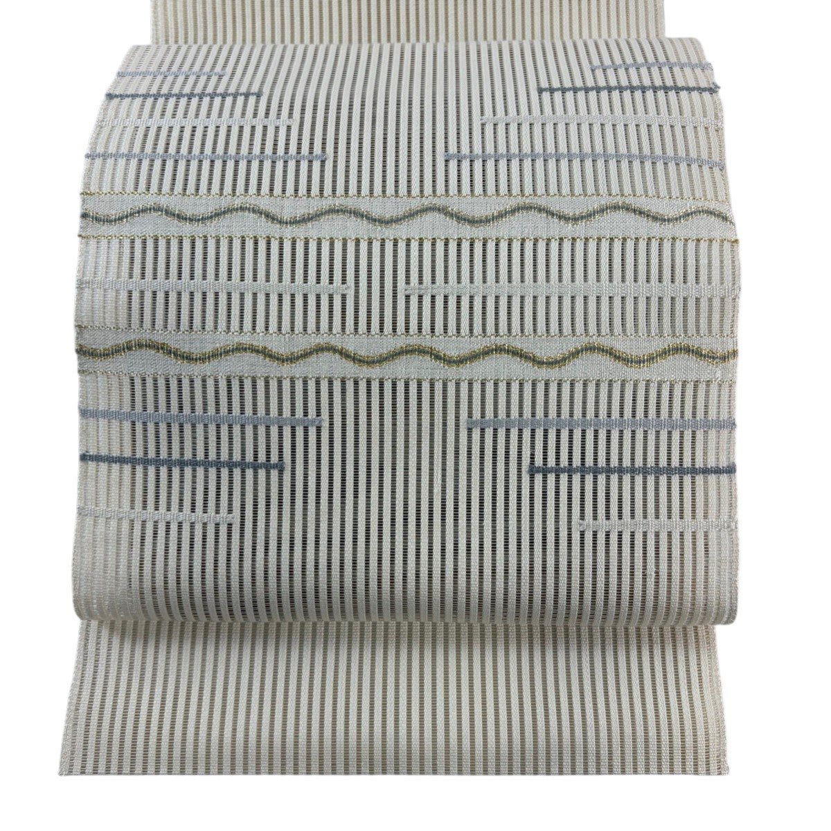 【美品】 名古屋帯 秀品 夏帯 絽 八寸名古屋帯 松葉仕立て トンネル仕立て 縞 幾何学模様 ベージュ 正絹