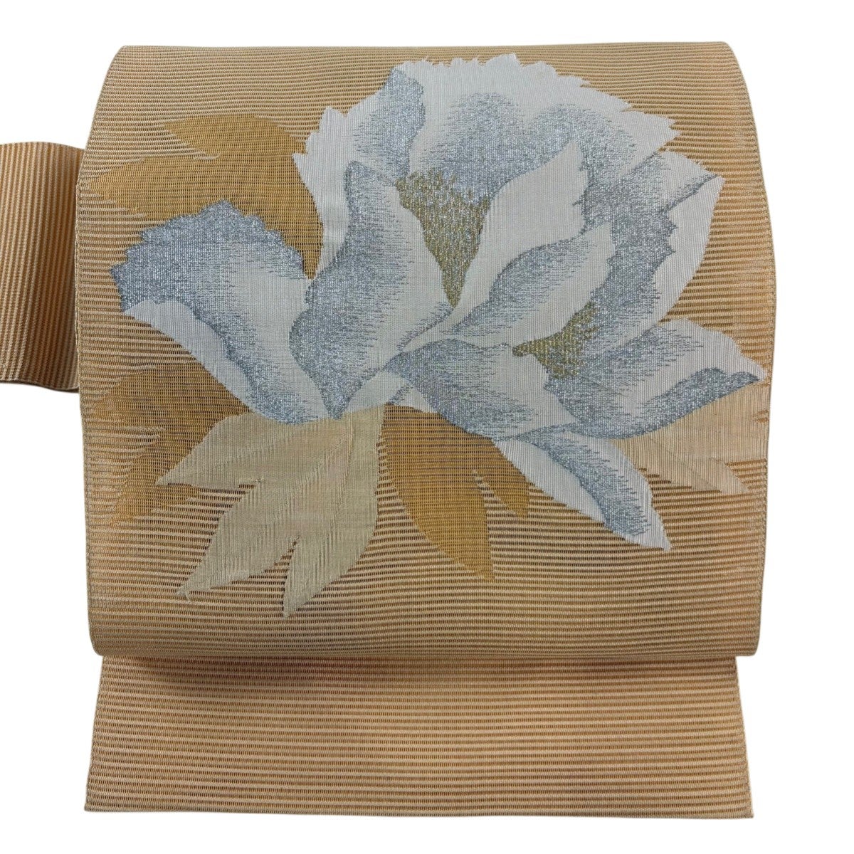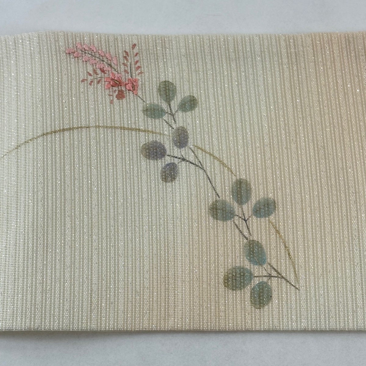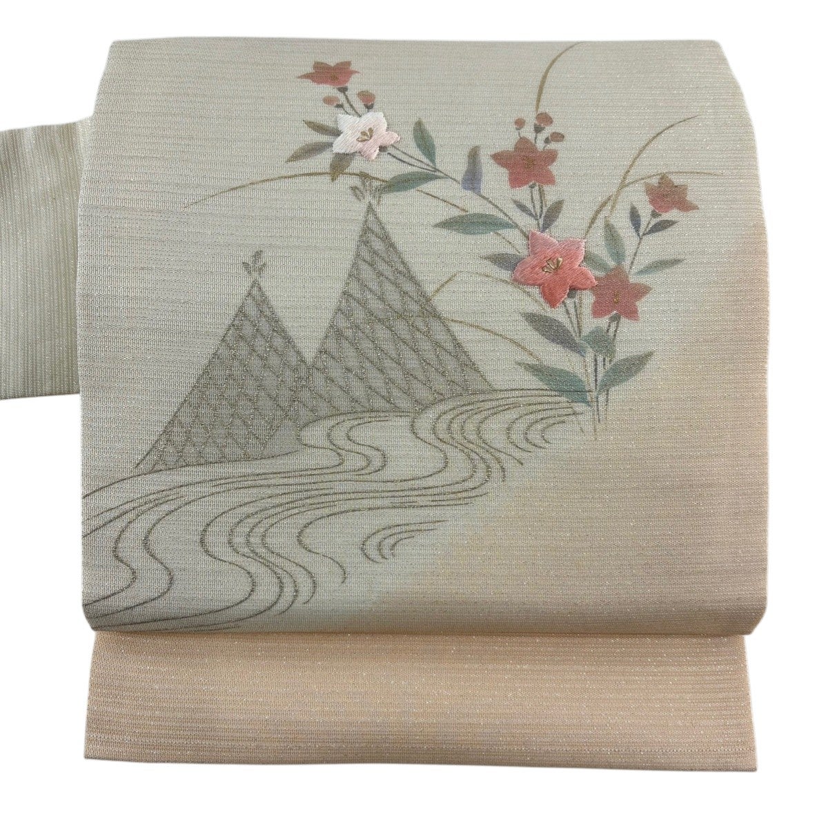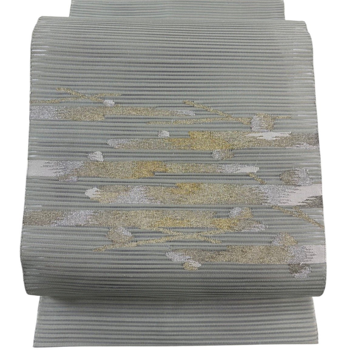 【美品】 袋帯 秀品 夏帯 秋草 流水 金銀糸 箔 ベージュ 六通 正絹