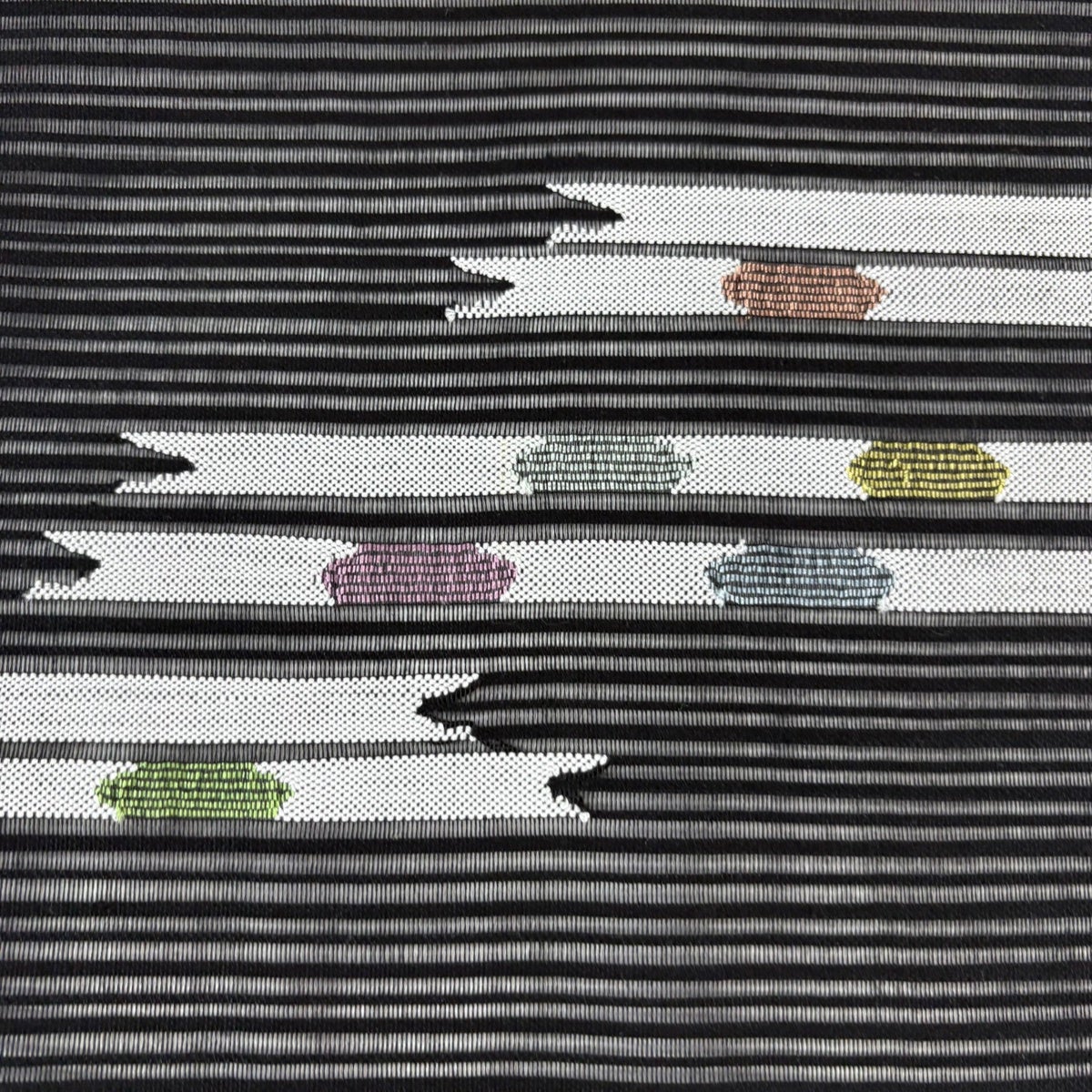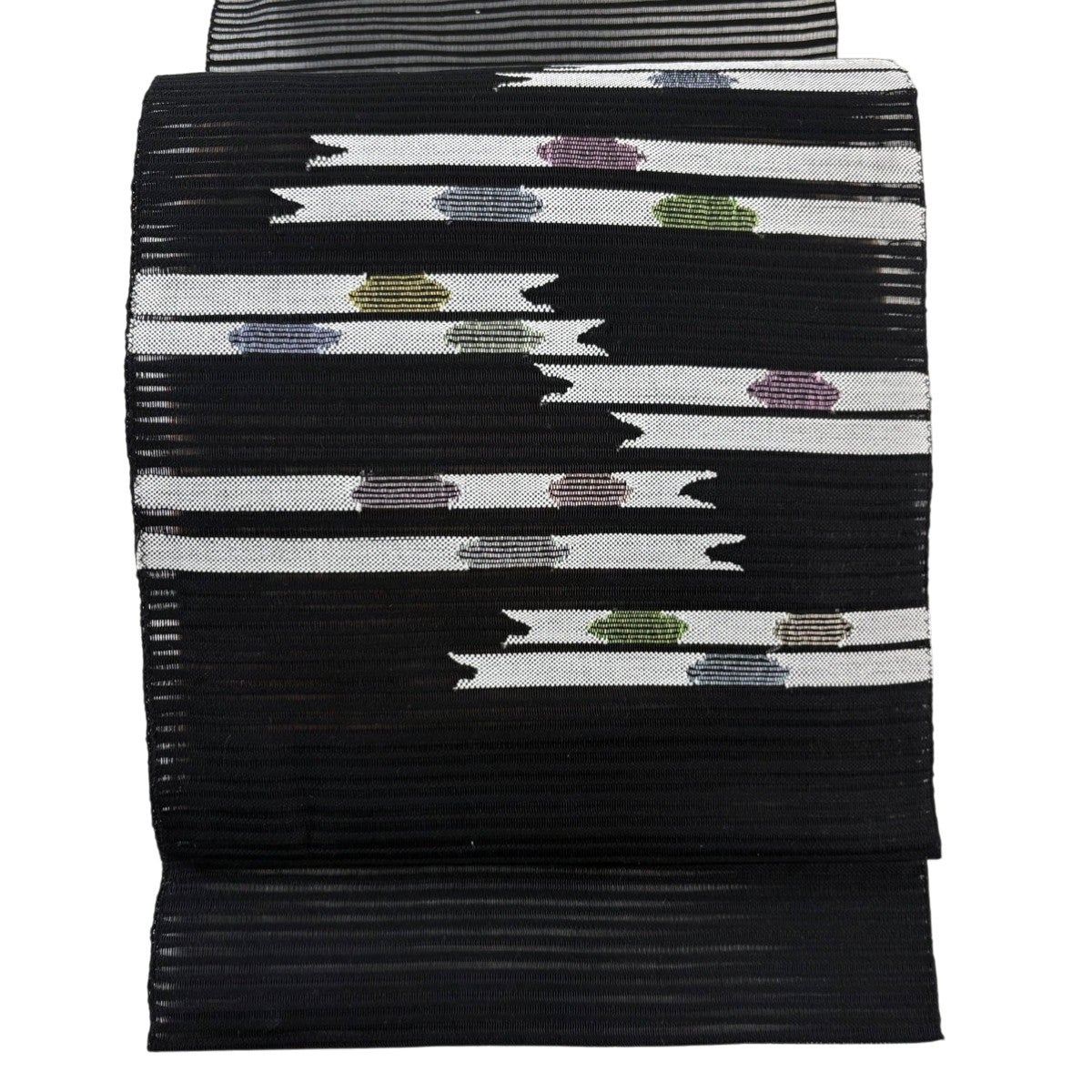 【美品】 名古屋帯 秀品 夏帯 八寸名古屋帯 松葉仕立て トンネル仕立て やまと 縞 幾何学模様 黒 正絹
