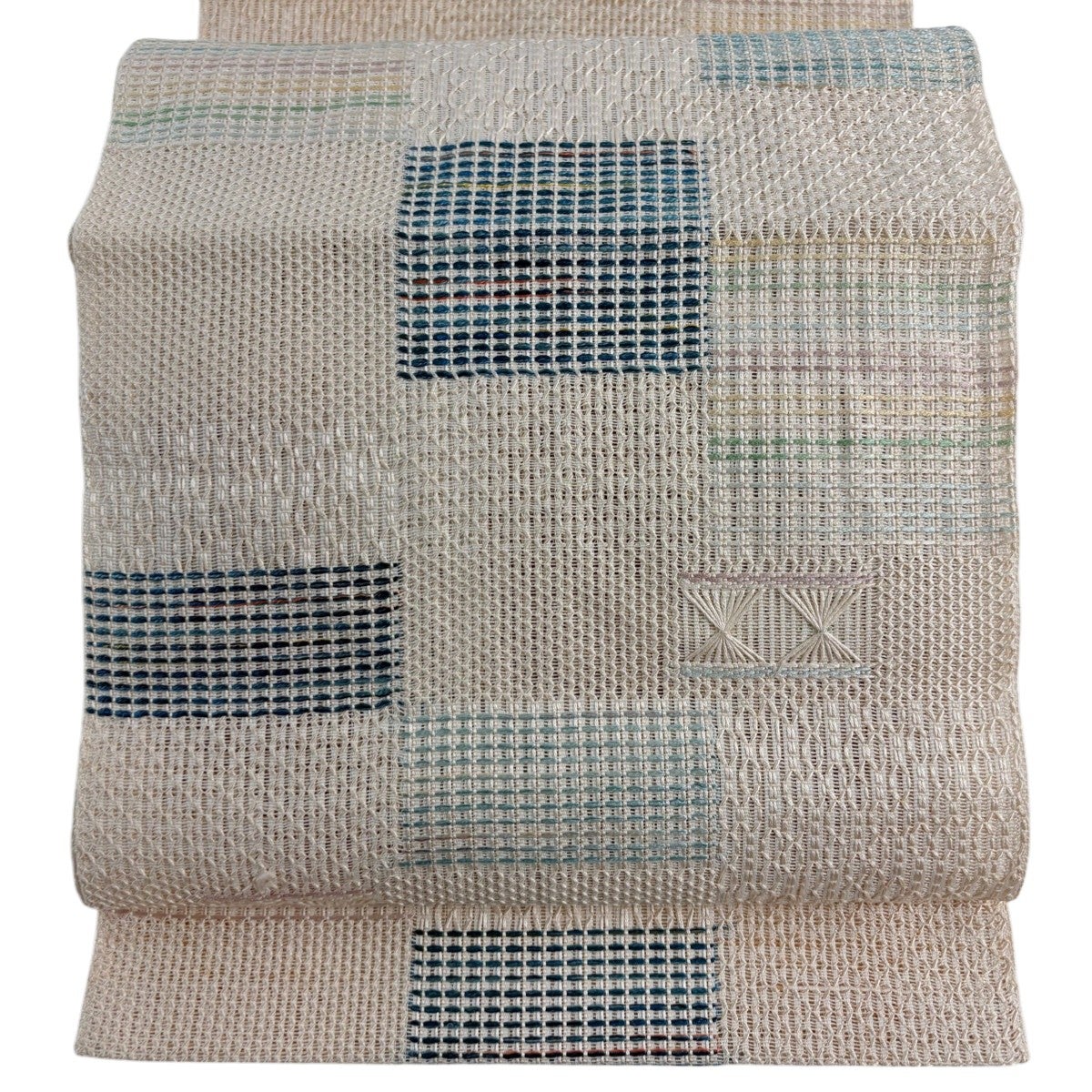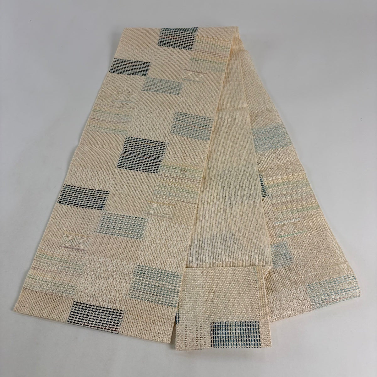 名古屋帯 秀品 夏帯 絽 八寸名古屋帯 変わり市松 菱 金銀糸 クリーム 正絹
