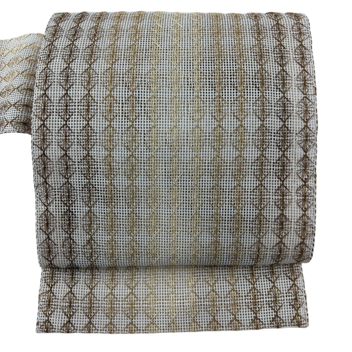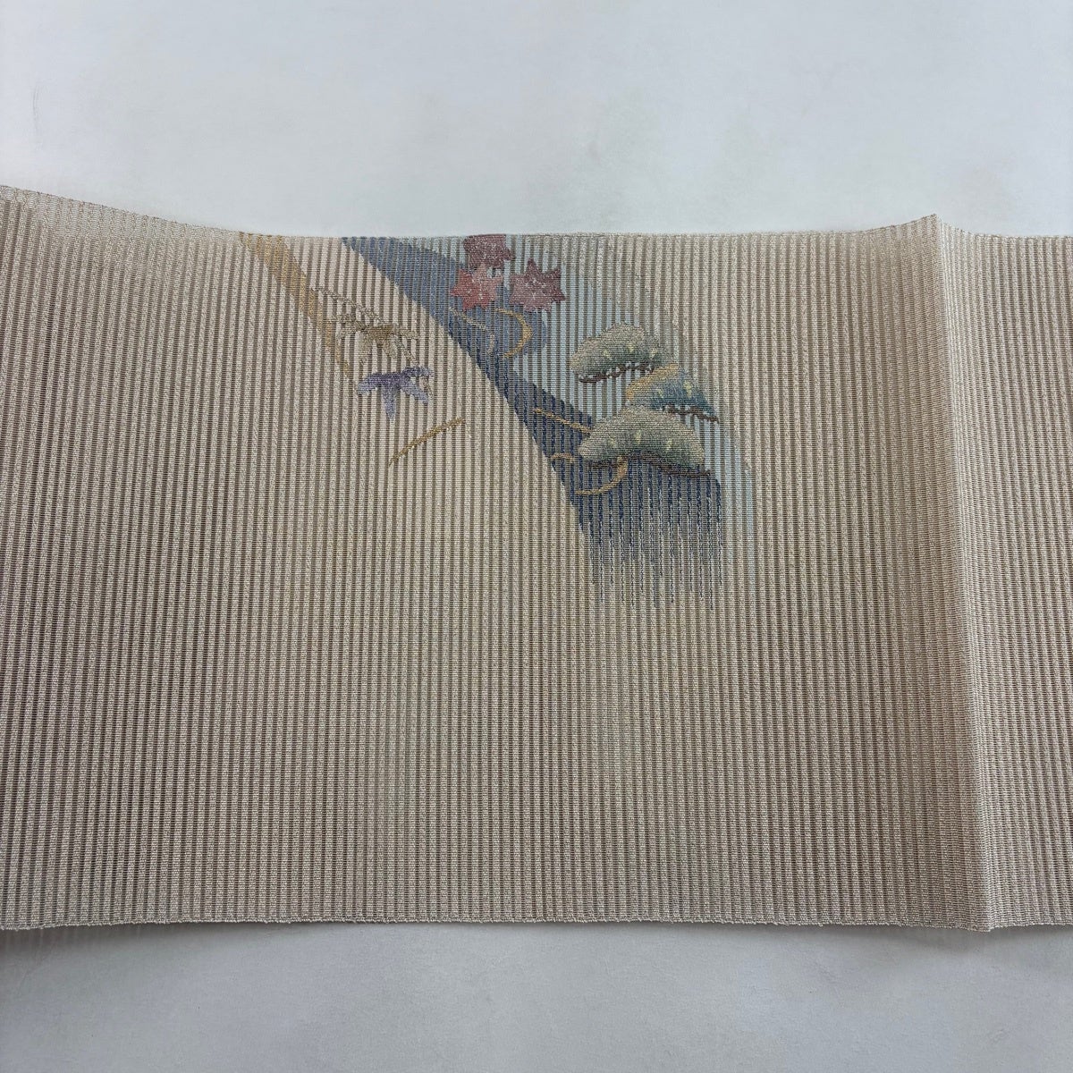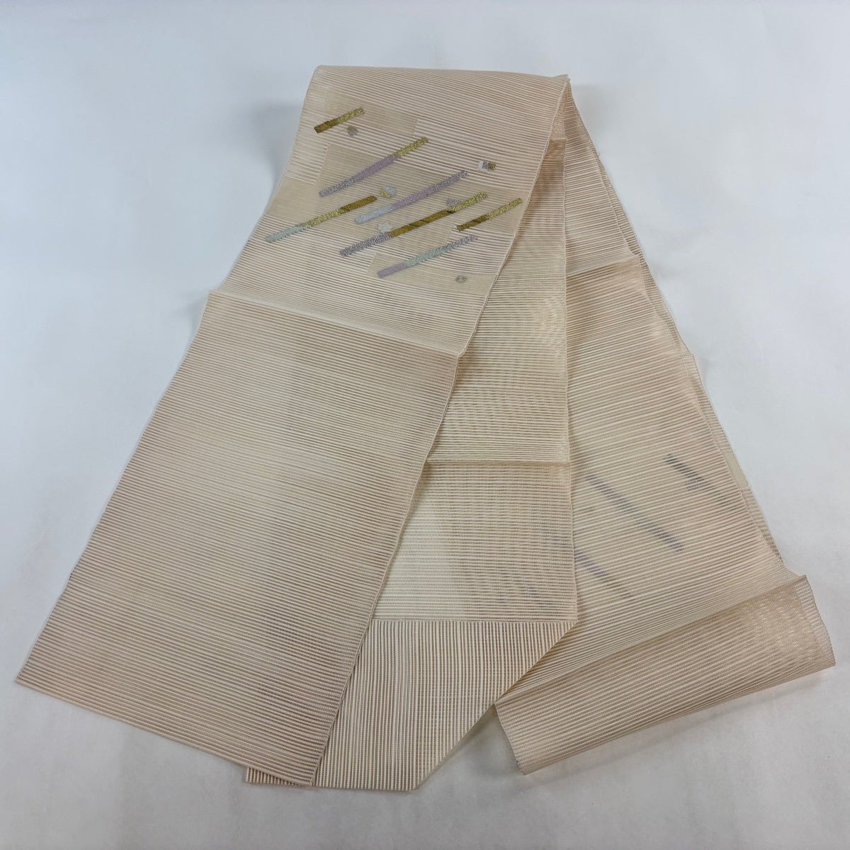 名古屋帯 秀品 夏帯 絽 八寸名古屋帯 松葉仕立て トンネル仕立て 斜縞 花 金銀糸 ベージュ 正絹