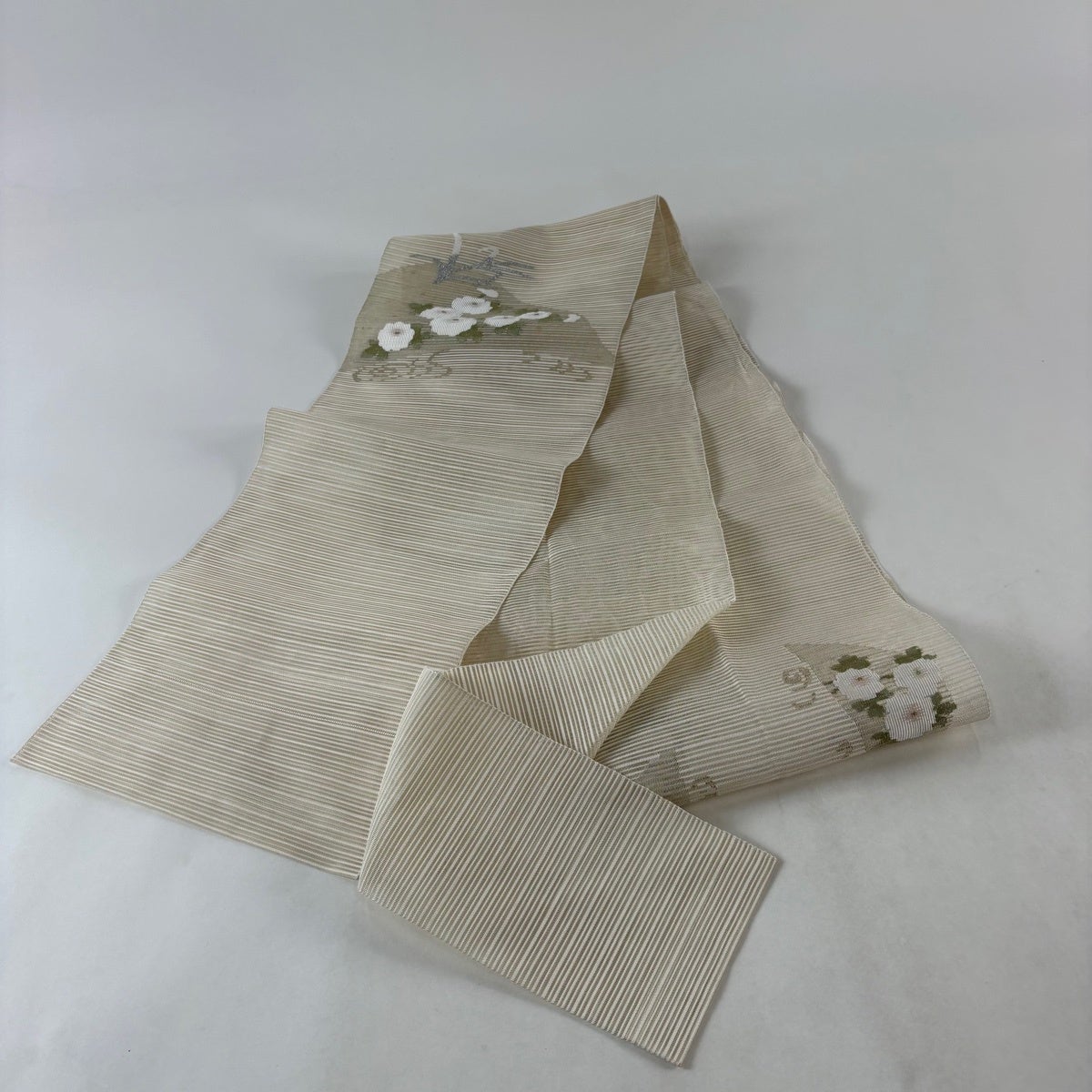 名古屋帯 秀品 八寸名古屋帯 松葉仕立て 夏帯 絽 菊 流水 金銀糸 クリーム 正絹