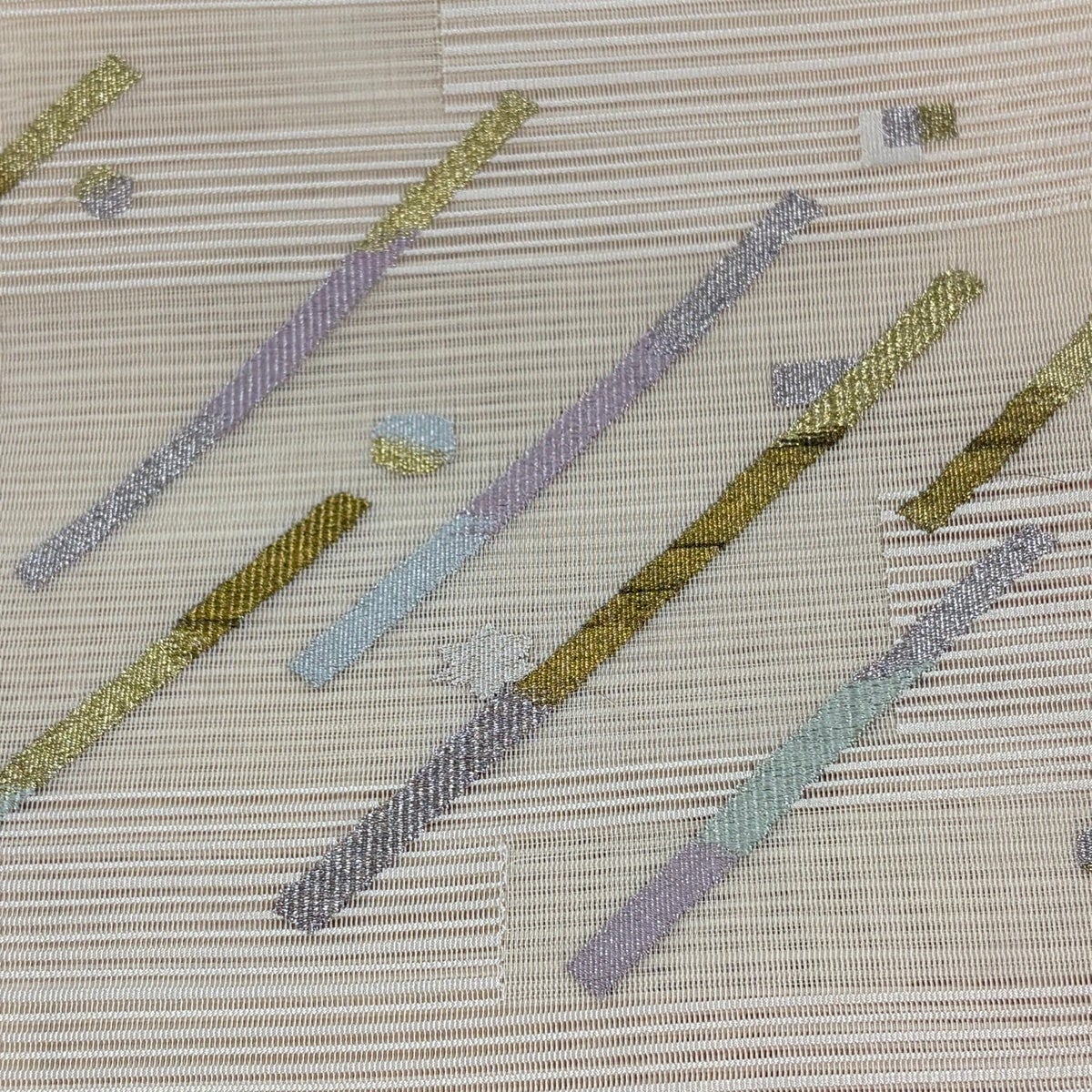 【美品】 名古屋帯 秀品 夏帯 絽 八寸名古屋帯 縞 幾何学模様 金銀糸 箔 ベージュ 正絹