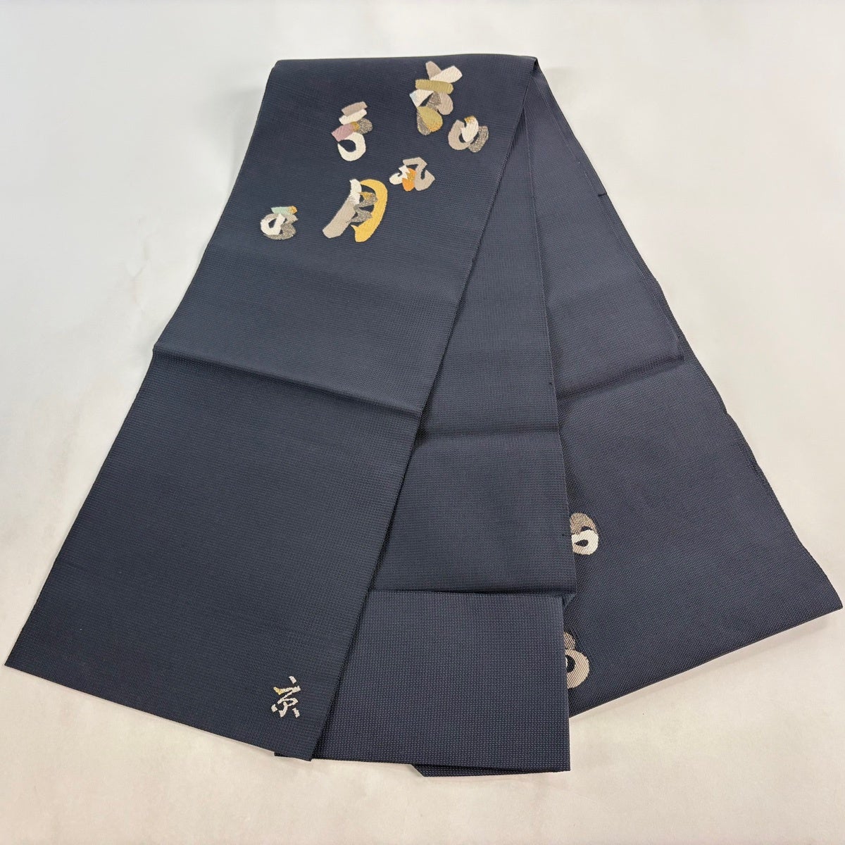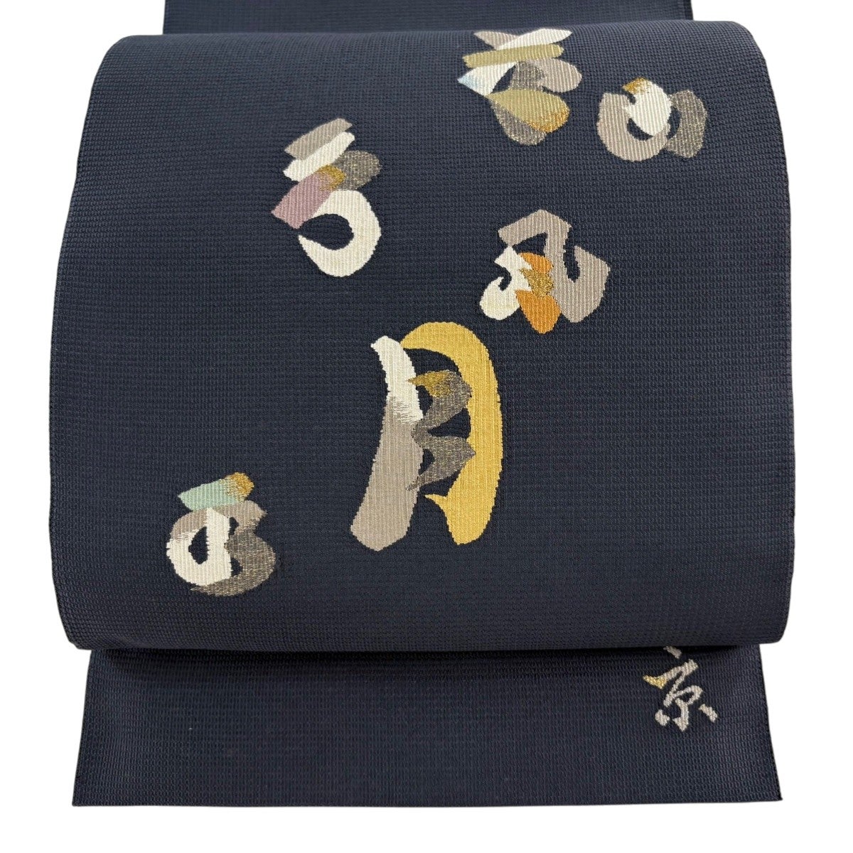 【美品】名古屋帯 秀品 松葉仕立て 八寸名古屋帯 文字文 金糸 紺色 正絹