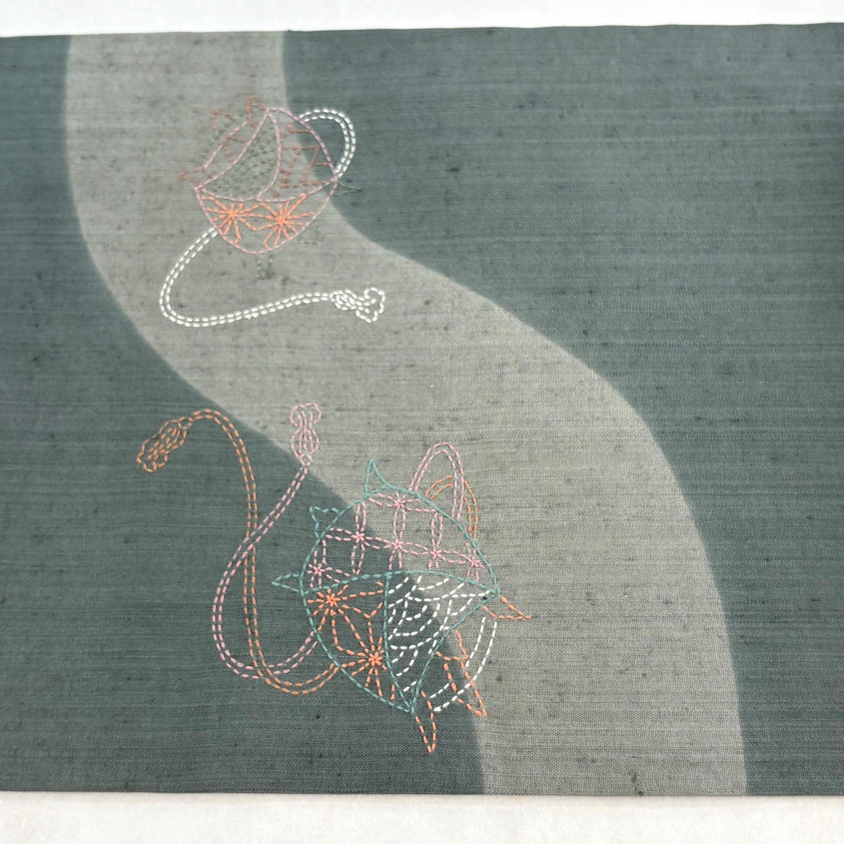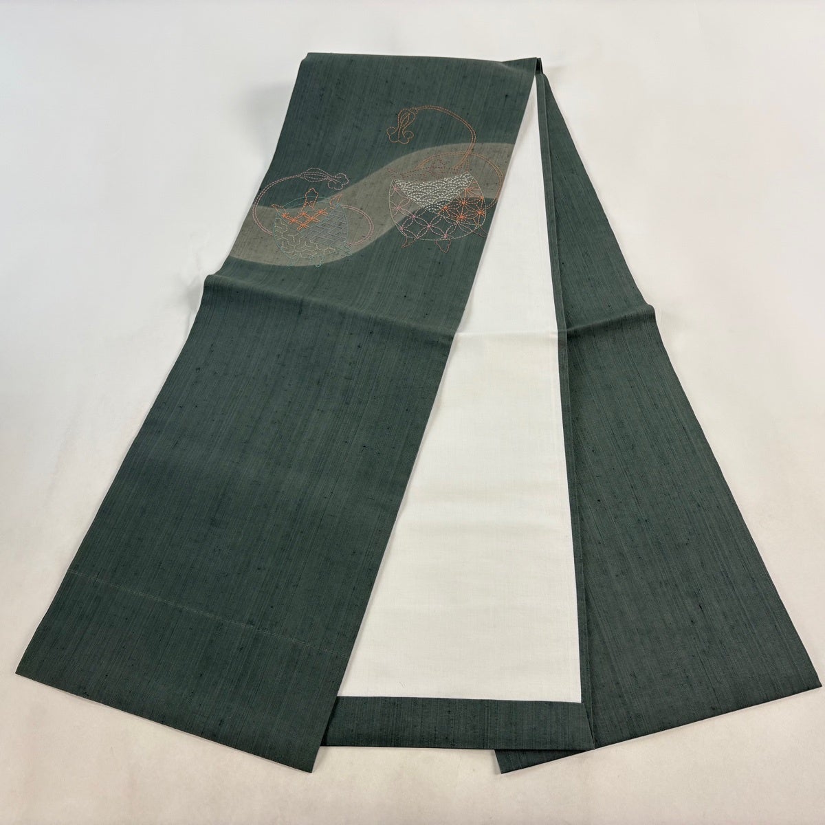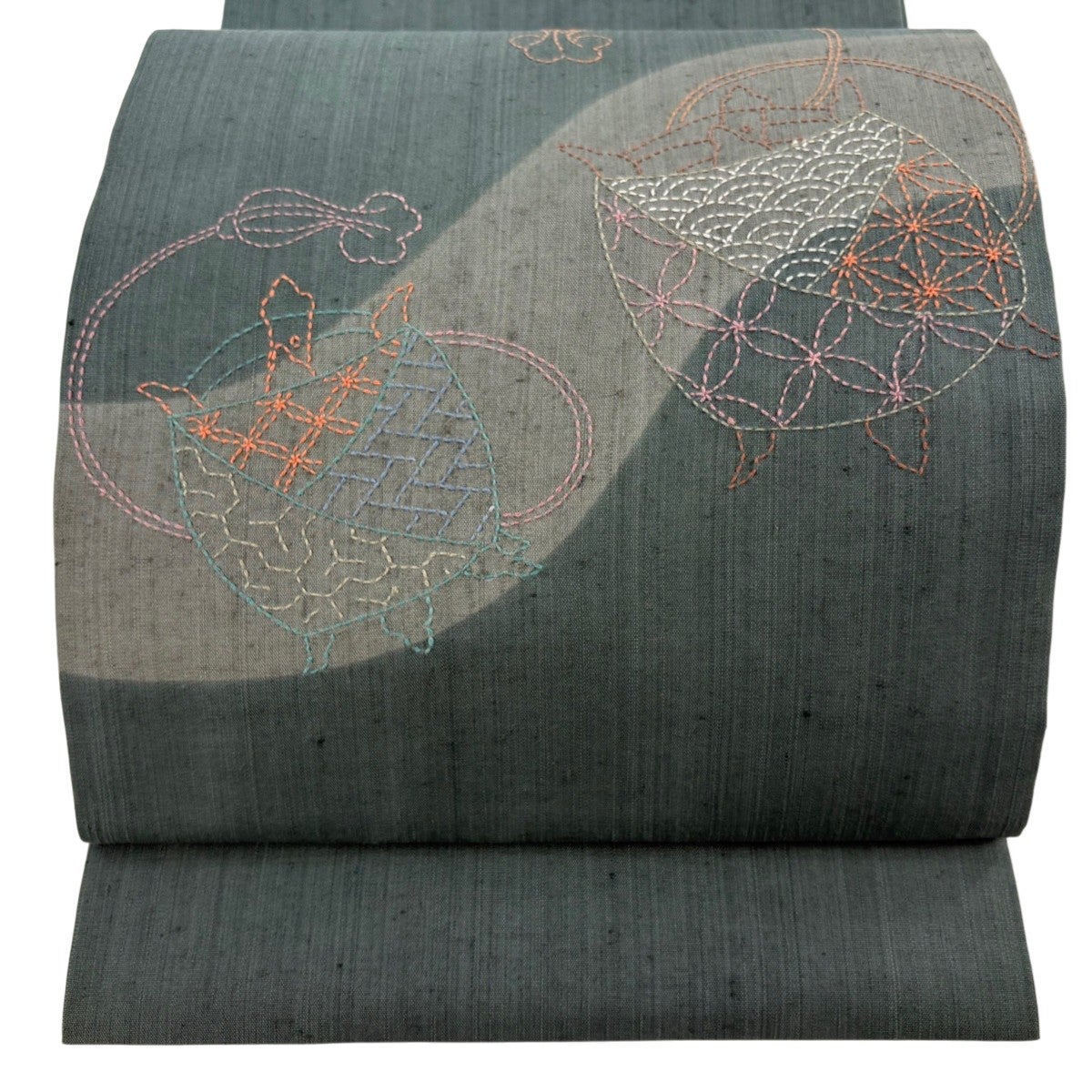 【美品】 開き名古屋帯 秀品 紬地 糸巻き 紐 刺し子刺繍 灰緑 正絹