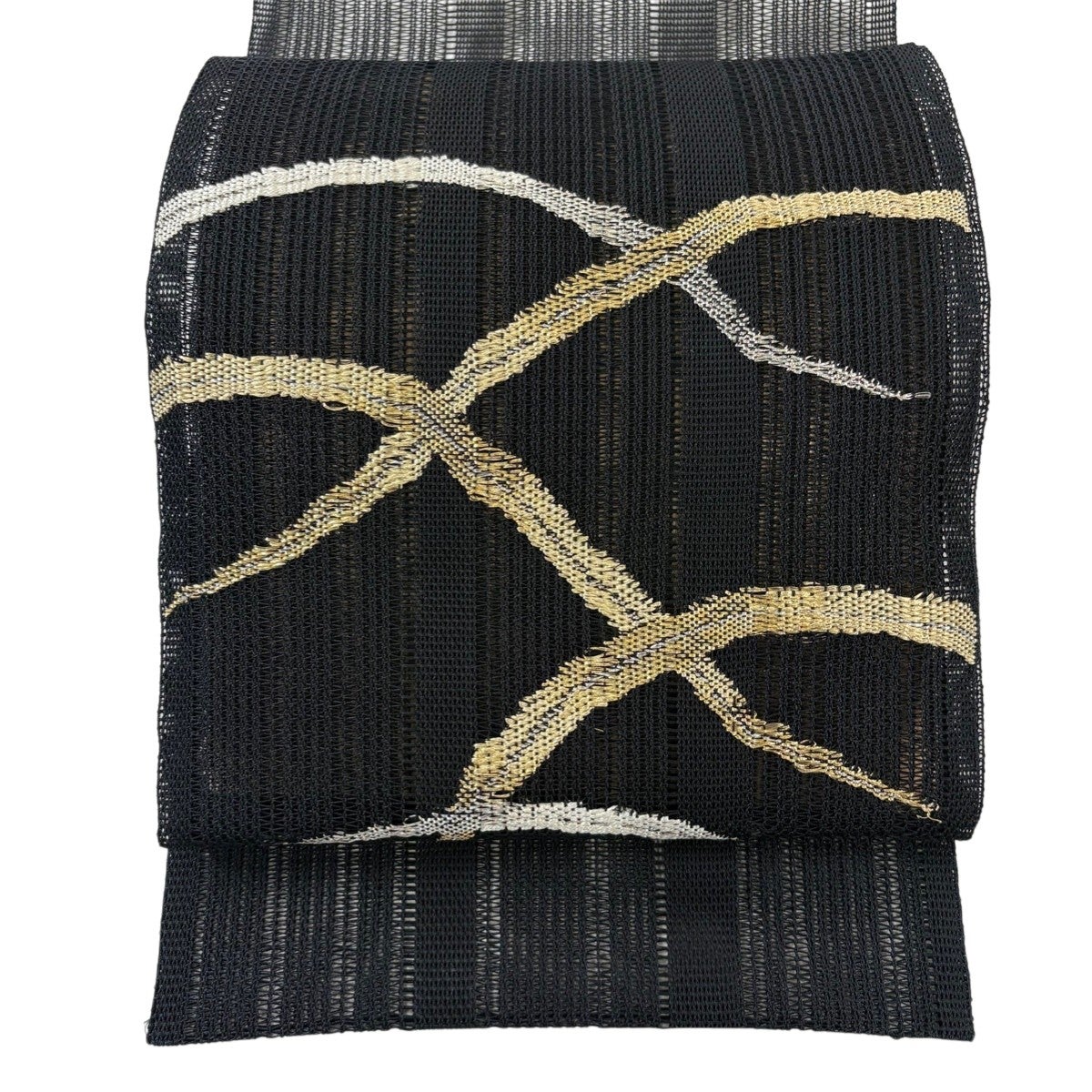 名古屋帯 秀品 夏帯 八寸名古屋帯 トンネル仕立て 幾何学模様 金銀糸 黒 正絹