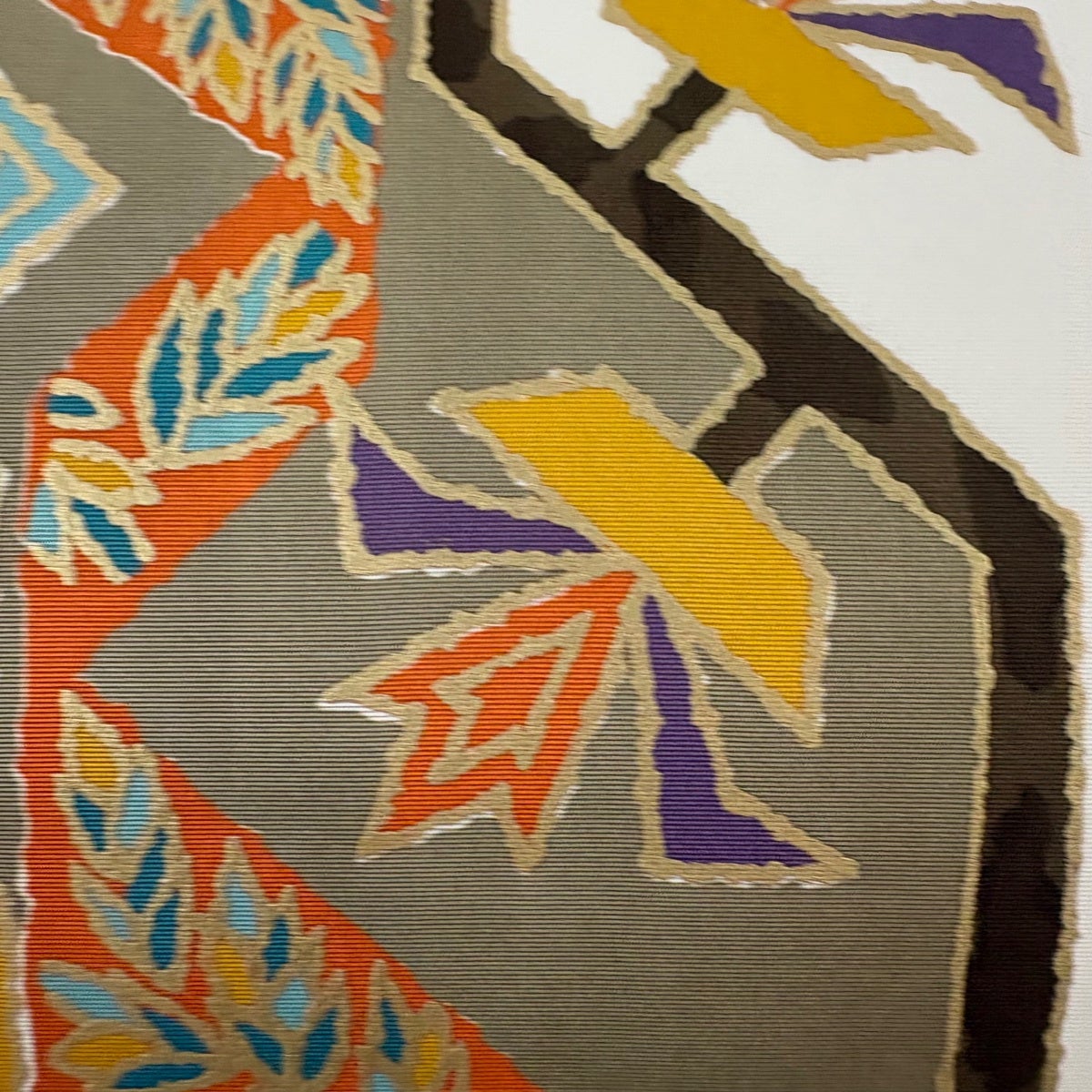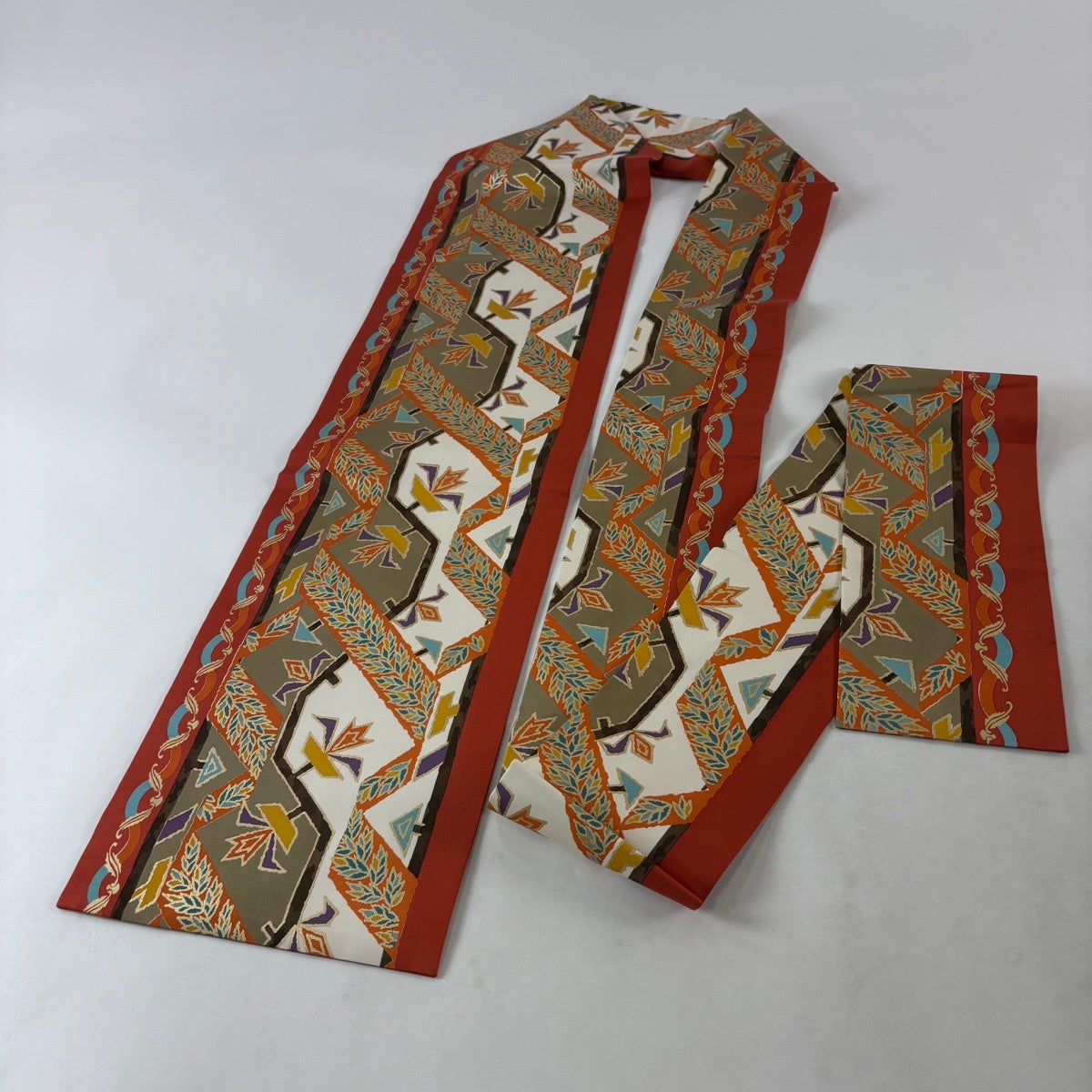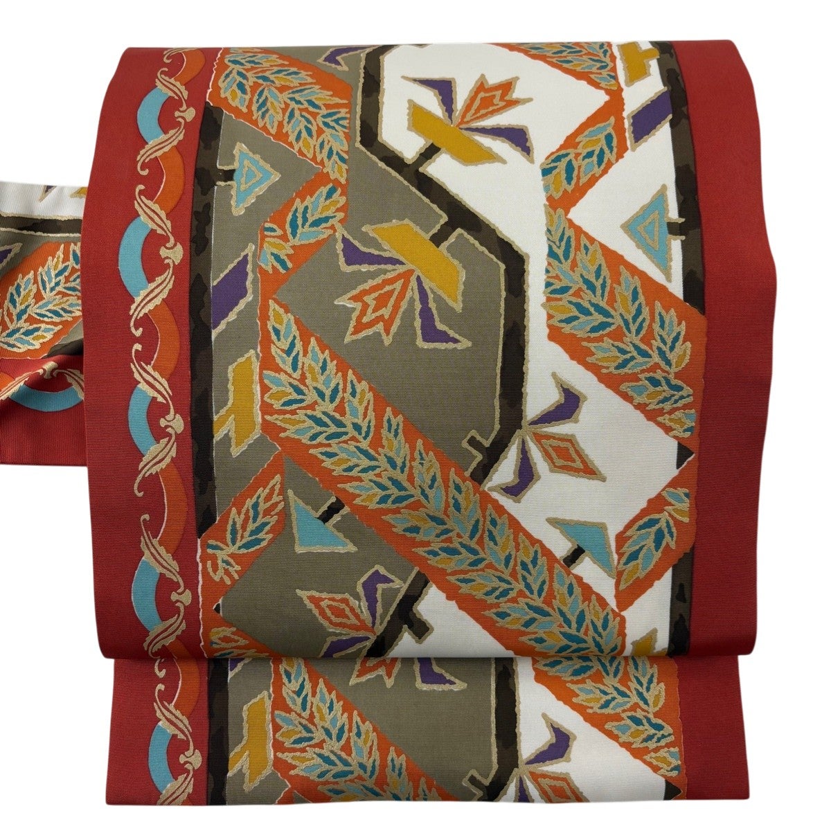 【美品】 名古屋帯 秀品 草花 幾何学模様 金彩 朱色 正絹