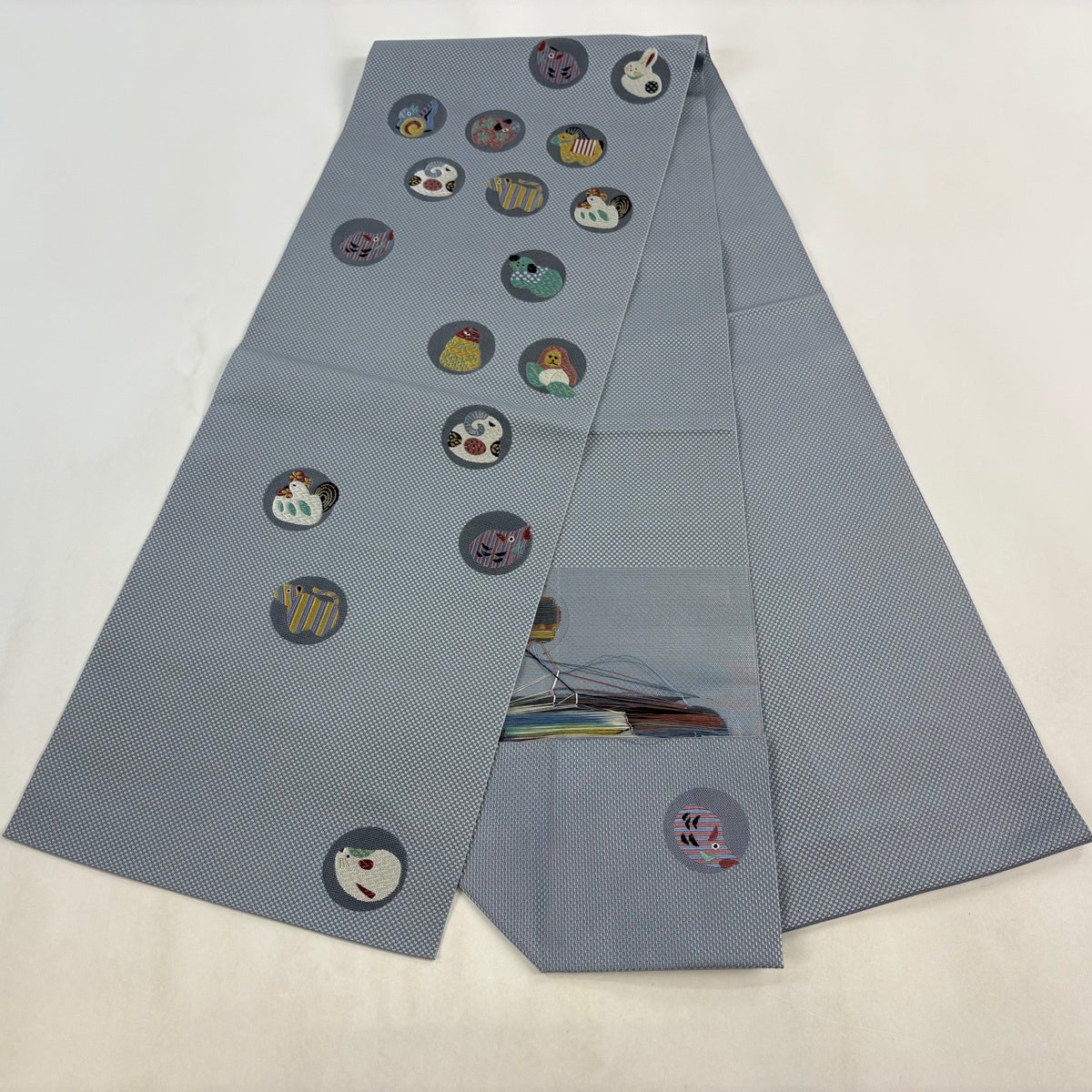袋帯 秀品 菊 鴛鴦 刺繍 金糸 灰紫 お太鼓柄 正絹