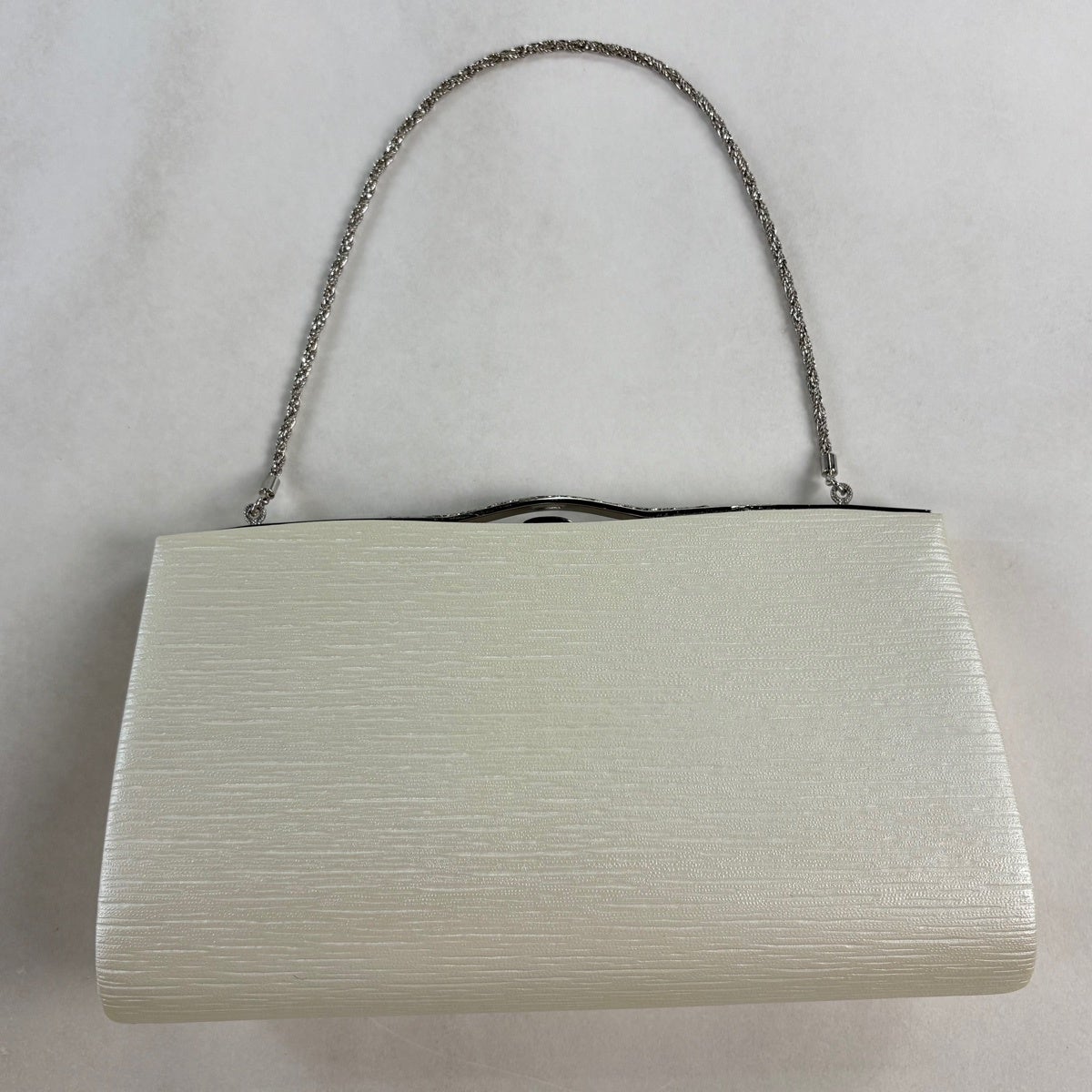 【美品】和装バッグ 優品 カジュアル チャーム付き リボン 縞 白 正絹 和装小物