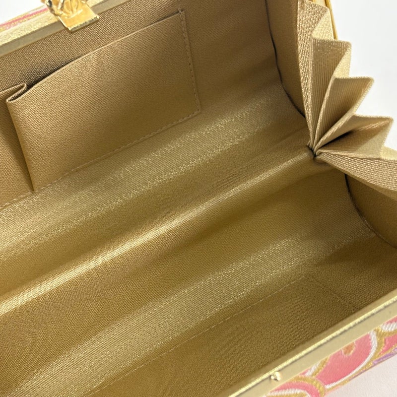 縦13cm 横22cm 奥行12cm 礼装向きの豪華な和装バッグでございます。 成人式だけでなく、結婚式などのフォーマルなお席にぴったりのお品物でございます。 目立ったシミ汚れは無くリユース品としては状態の良いお品でございます。 沢山の商品の中からご覧いただき誠にありがとうございます。