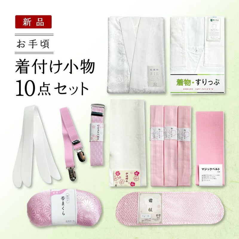 【内容品・素材】 《長襦袢》 ポリエステル100% 《着物スリップ》 上見頃:綿100% 下見頃:ポリエステル100% 《その他小物》 腰紐:ポリエステル80% 綿20% 伊達締め:生地-レーヨン100% 芯地-ポリエステル100% 帯枕:本体-スチロール 布-レーヨン100% 紐-綿100% 衿芯:ポリエチレン ウエストベルト:ベルト-ポリエステル100% 留め具-ステンレス 着付ベルト:ベルト-ポリエステル100% 織ゴム-ポリウレタン クリップ部分-ステンレス 前板:ポリエステル100% 綿100% マジックベルト:ナイロン53% ポリエステル41% ポリウレタン6% お手頃価格の商品を揃えた、お財布にやさしい着付セットです。 腰紐について、色味は入荷状況によって変わります。 【注意】 1.掲載商品は複数店舗で同時販売している為、ご注文時点で在庫がない場合がございます。予めご了承ください。 2.新品商品の為、当商品の不良品以外の理由での返品は不可となります。