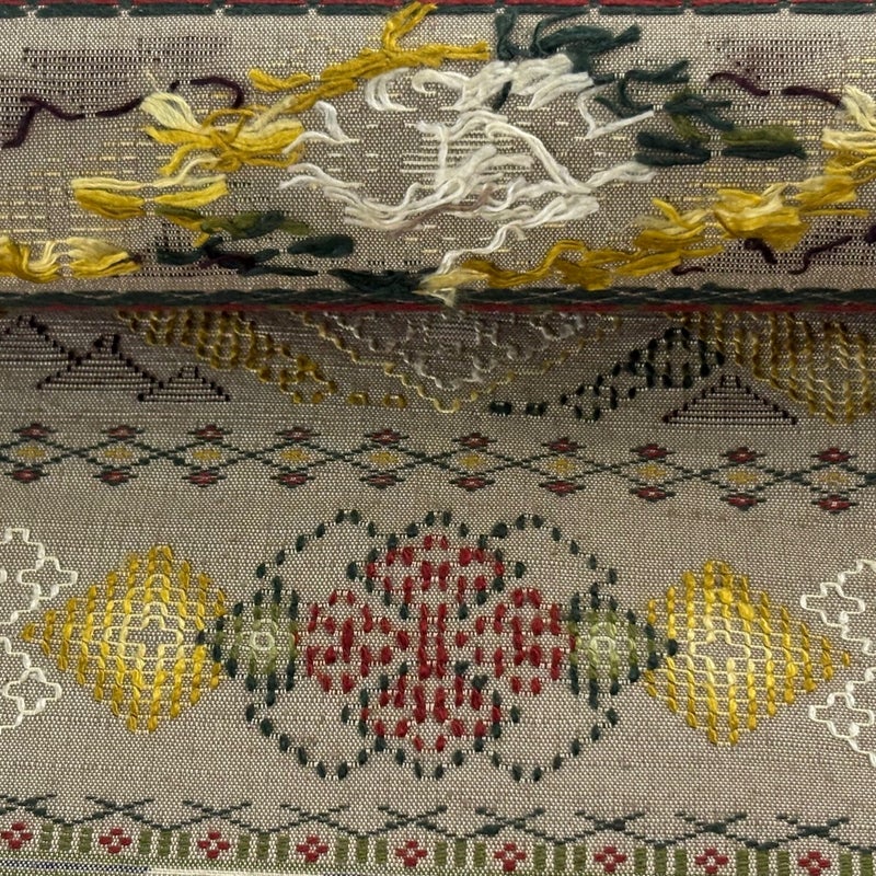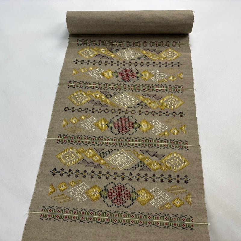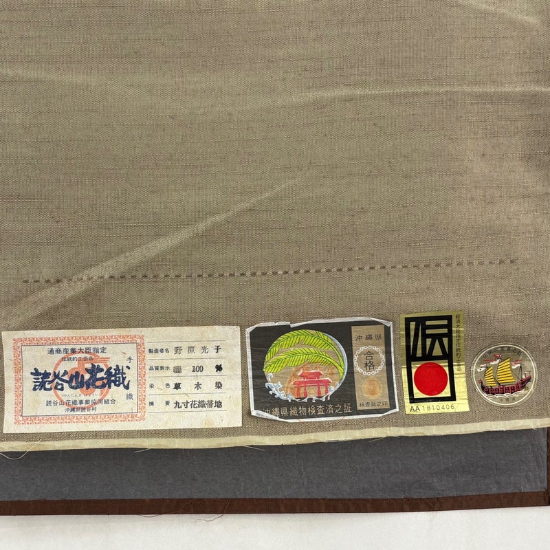 沖縄本島にある読谷村で織られる花織の紬織物の帯反物になります。 絣や色地には白や赤、黄、緑、紫、藍などで絣を併用し、花のような幾何学模様を浮き織りにするのが特徴です。 全体を広げての詳細な状態確認・採寸は一切行っておりません。 また、リユース品で仕立て専門業者ではないため用途については断言できかねます。 ご了承いただいた上でのご購入をよろしくお願いいたします。 【PR2】