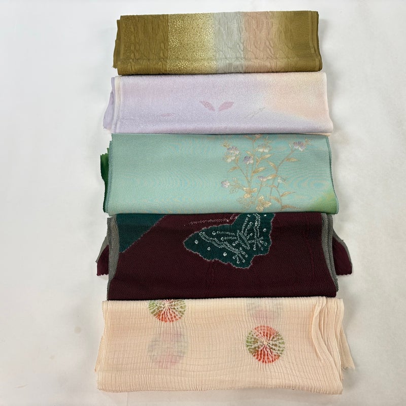 お買い得な帯揚げ5枚セットです。 色や柄など様々です。 1点ずつ丁寧に細部まで状態確認しておりません。 リユース品ですので、多少の傷みや使用感もございますが、 いずれもあまり目立たず、まだまだお使いいただけると思います。 素材は主に正絹です。(全ての素材の確認はしておりません。)
