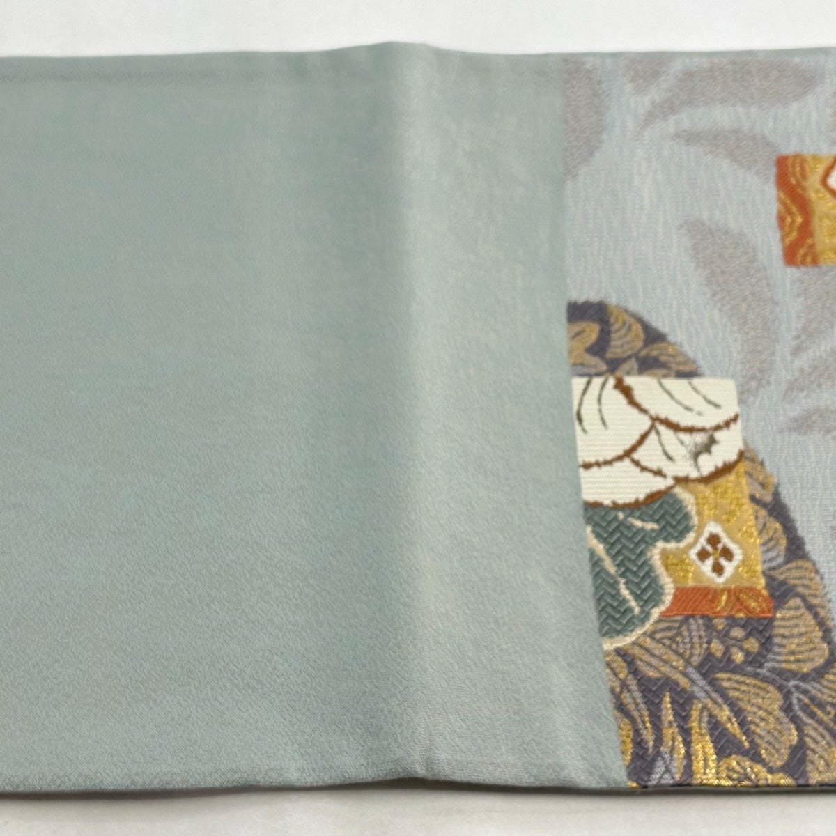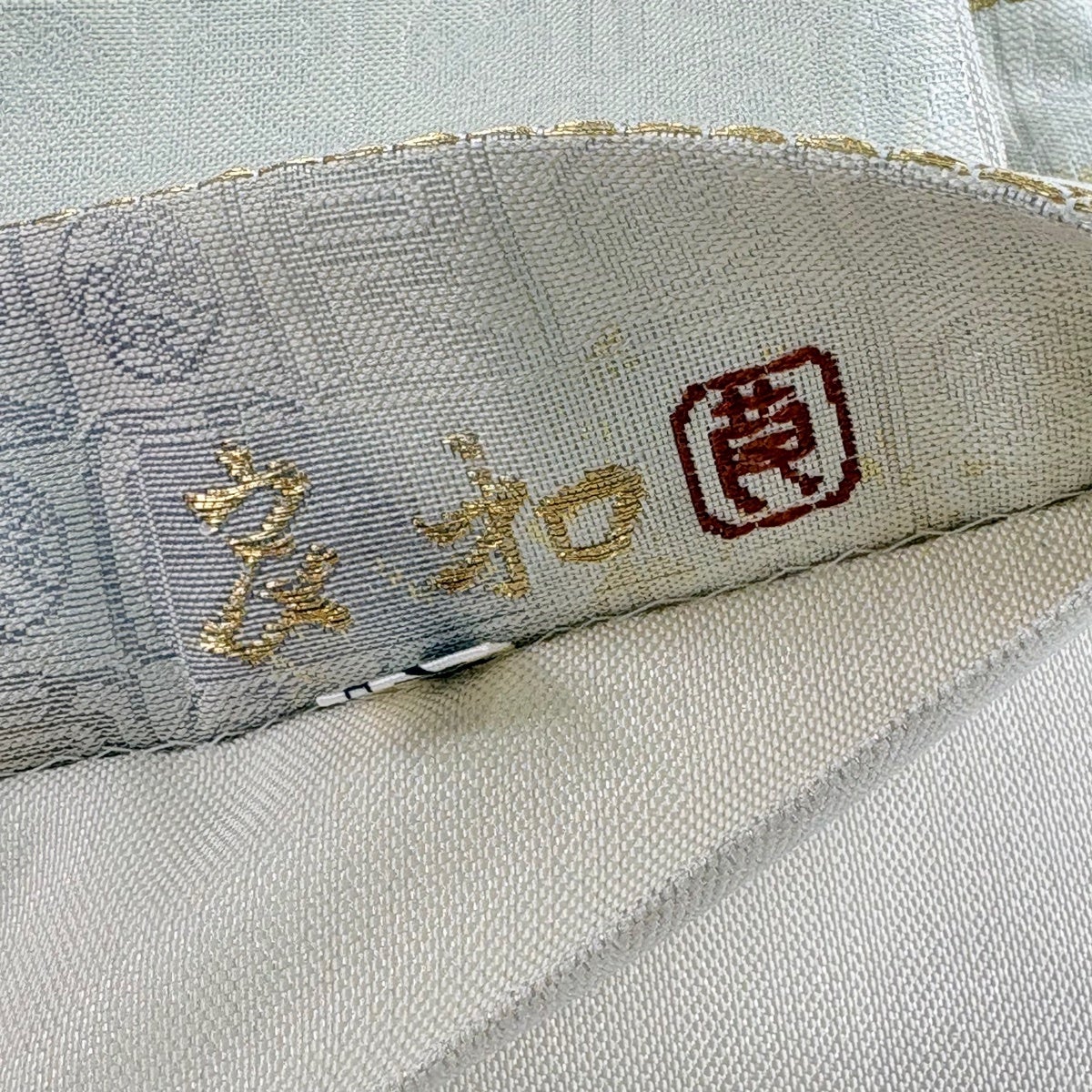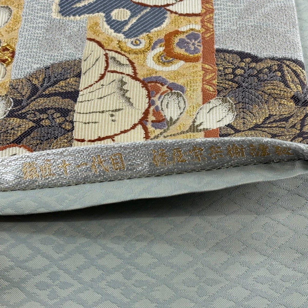 【美品】 袋帯 逸品 落款あり 織匠十一代目 篠屋宗兵衛 草花 桐 金糸 刺繍 青灰色 六通 正絹
