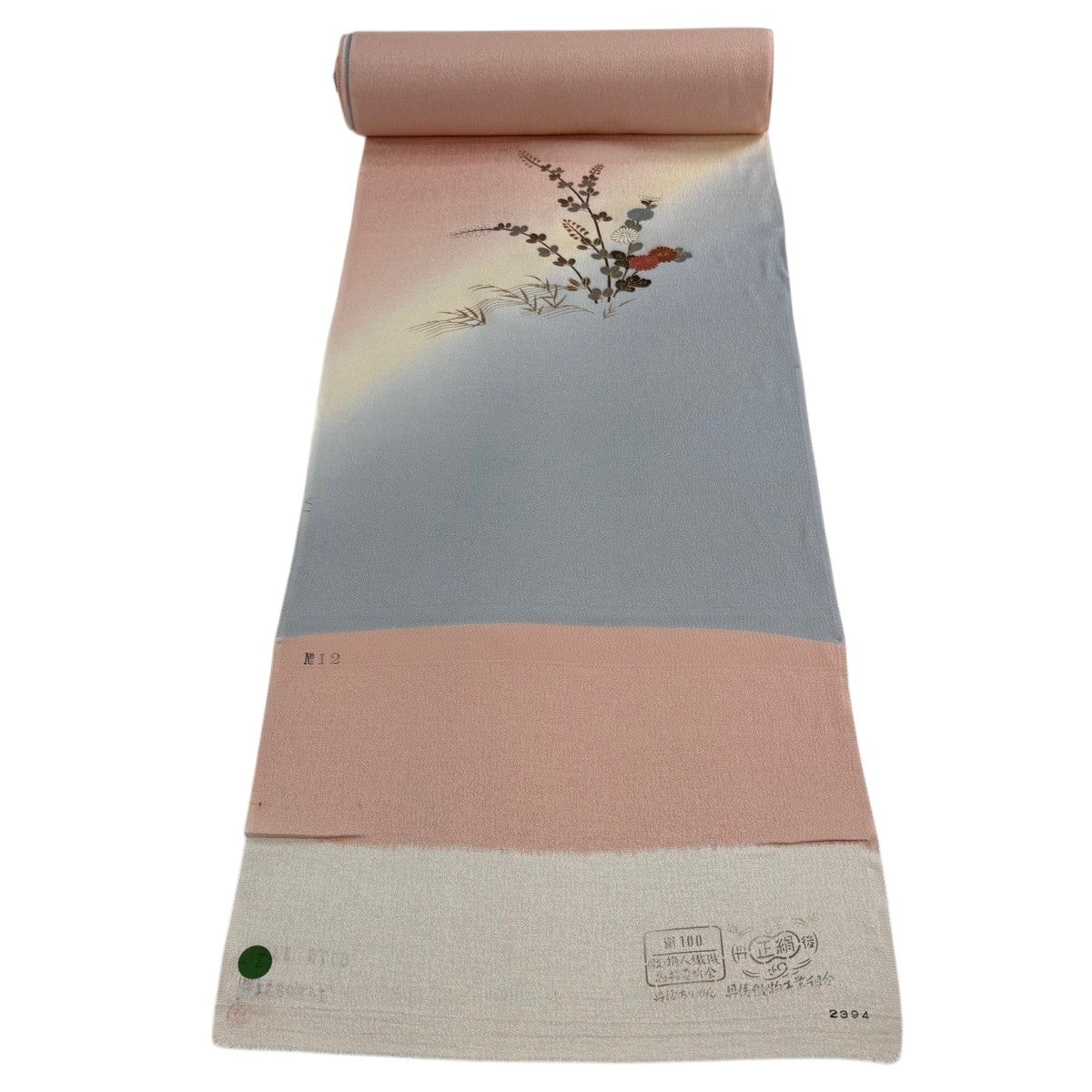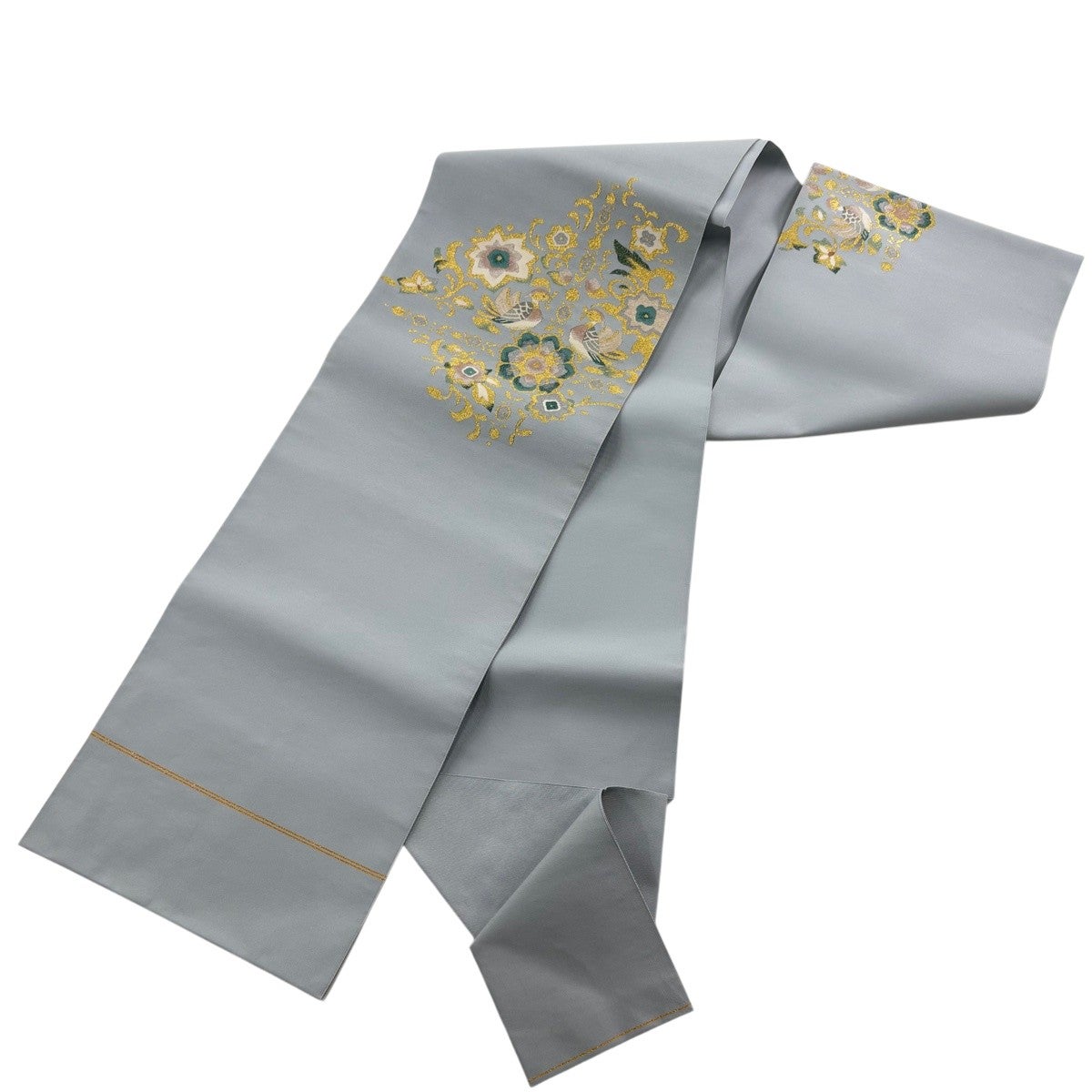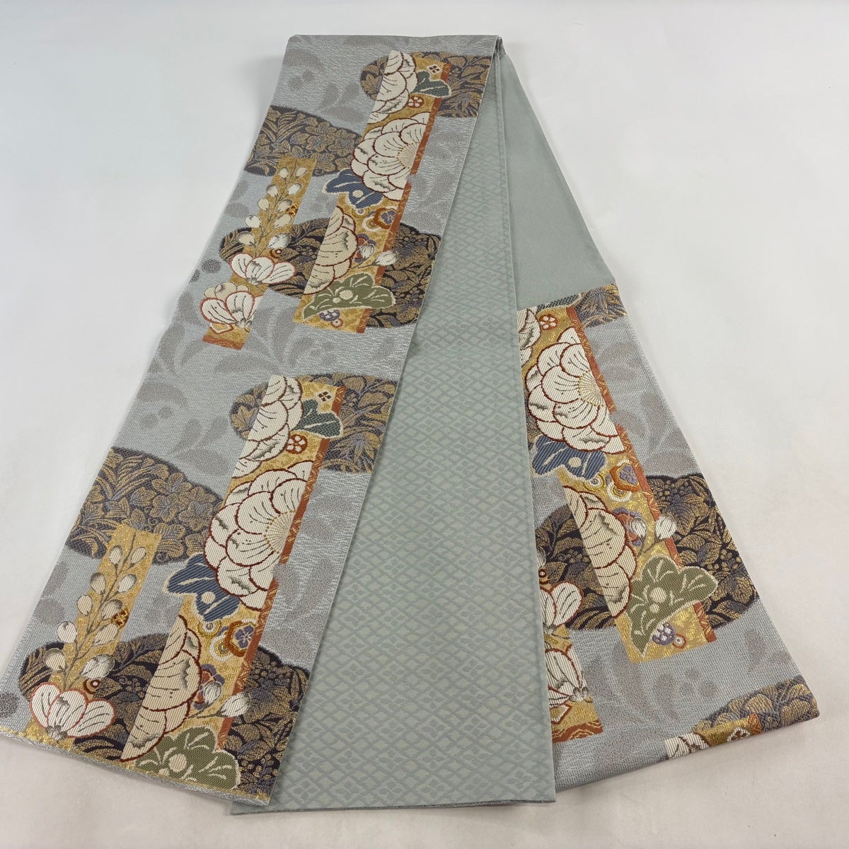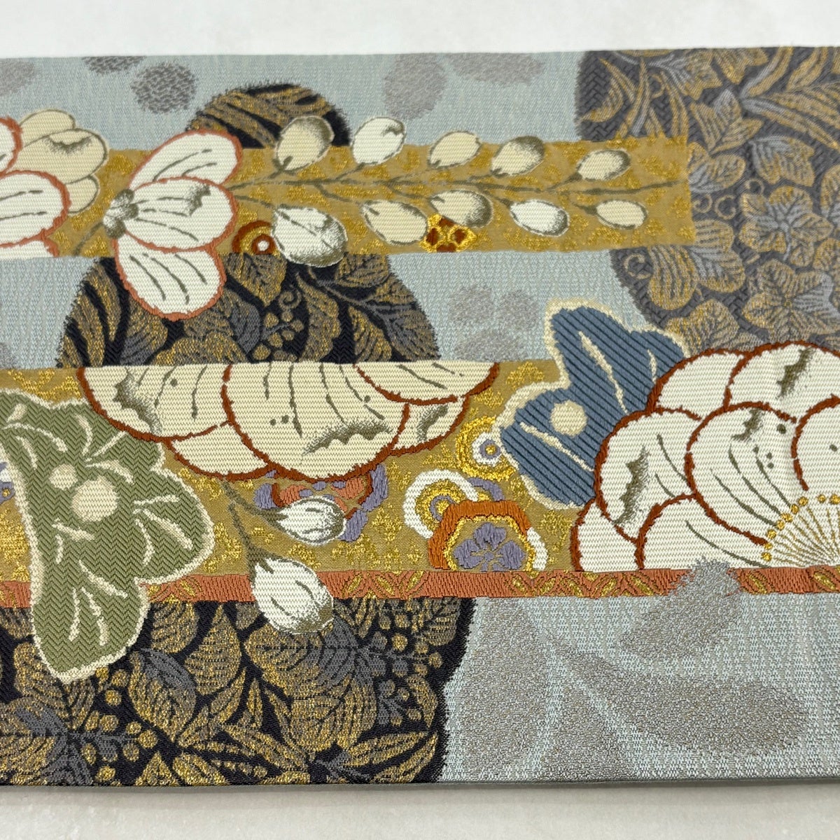 【美品】 袋帯 逸品 落款あり 織匠十一代目 篠屋宗兵衛 草花 桐 金糸 刺繍 青灰色 六通 正絹