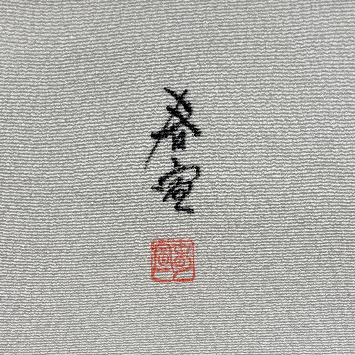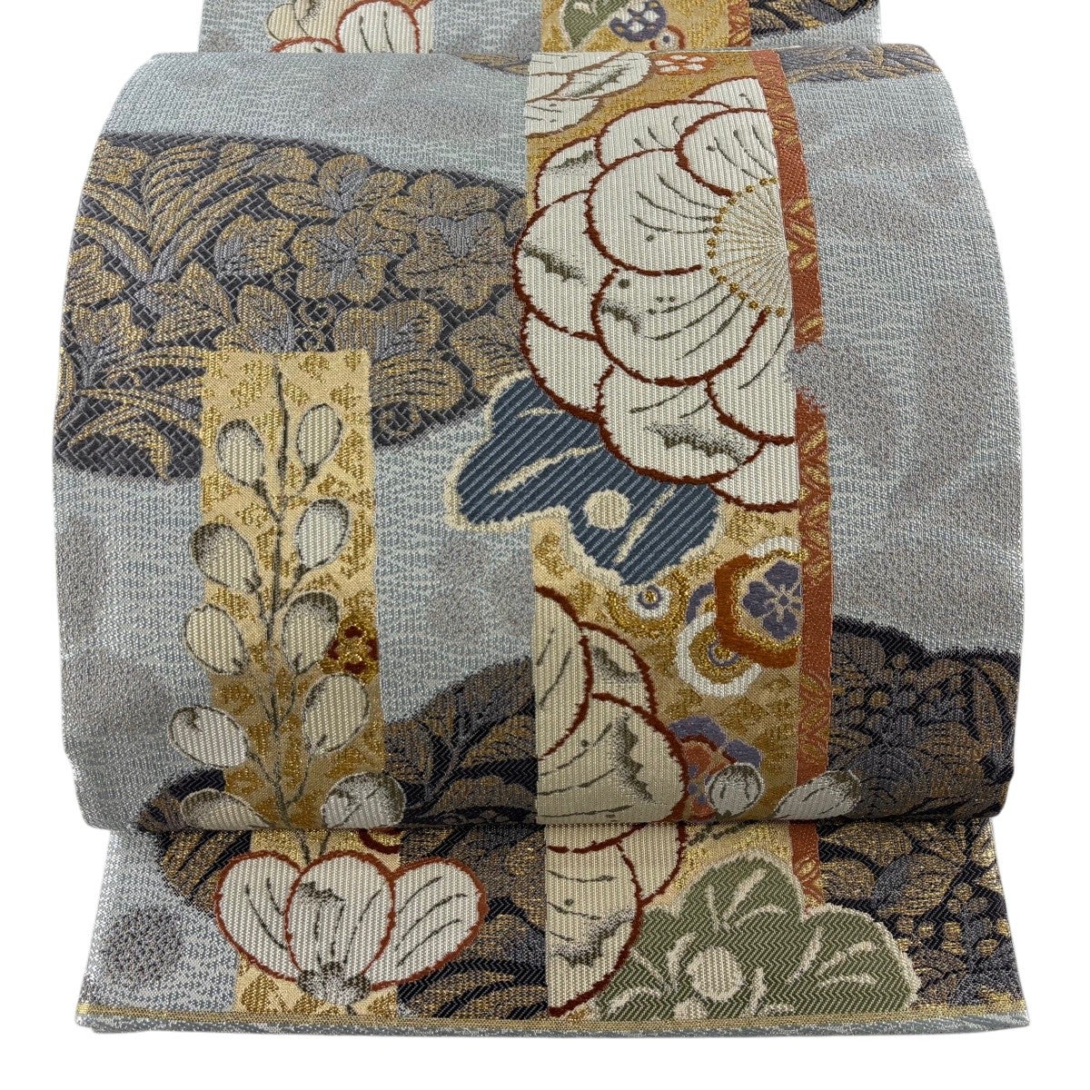【美品】 名古屋帯 名品 落款あり 山科春宣 鳥 葉 金彩 灰色 正絹