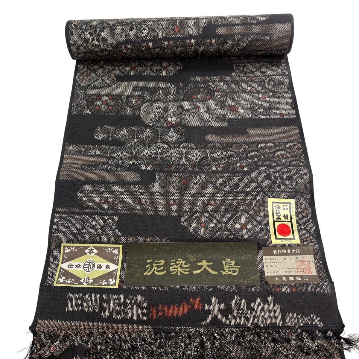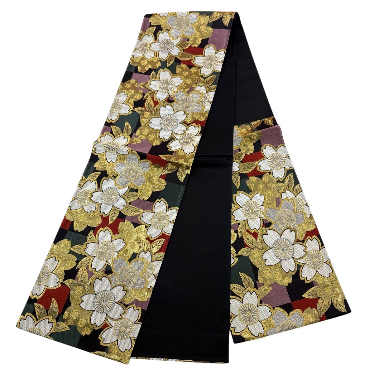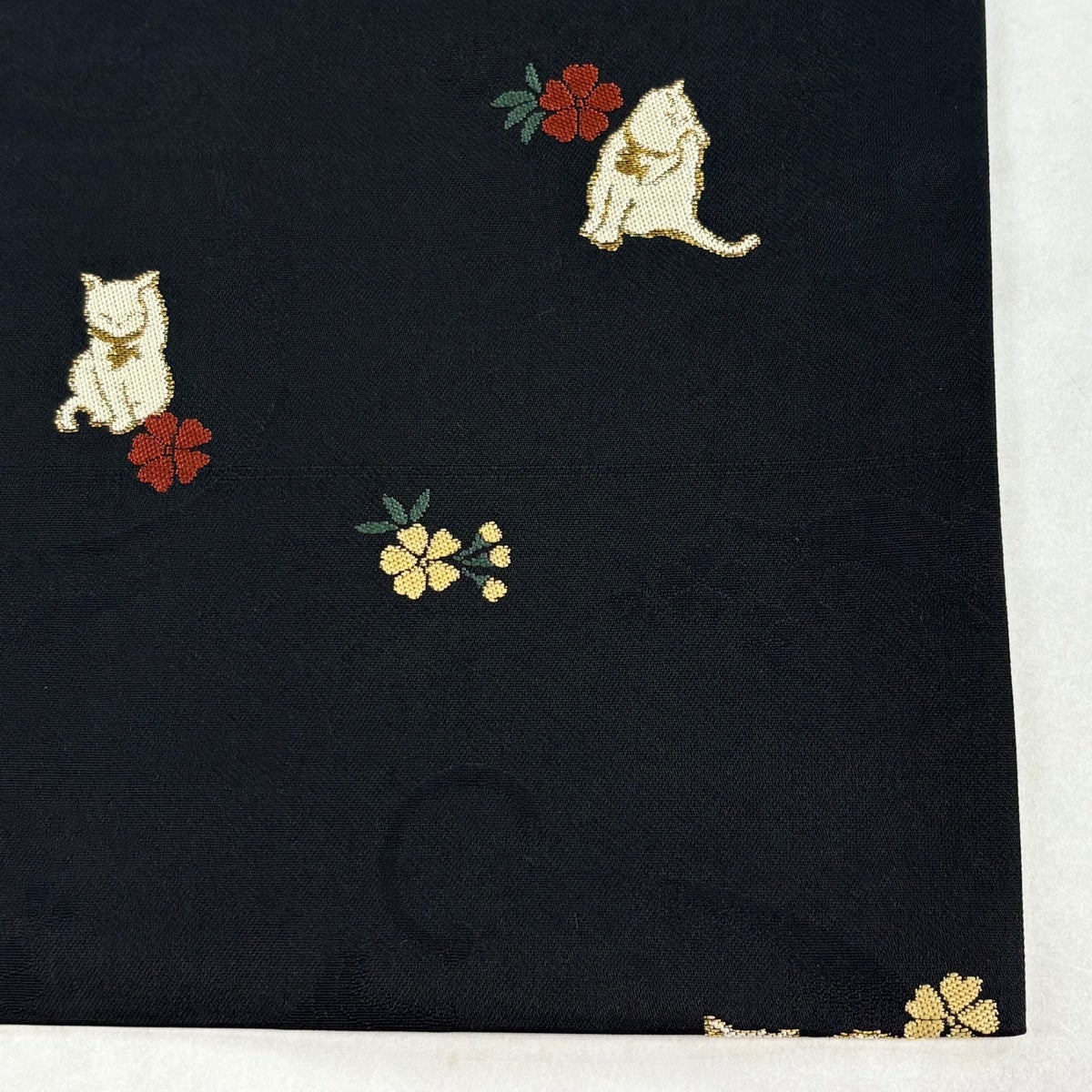 【美品】 名古屋帯 逸品 猫 桜 金糸 刺繍 黒 正絹