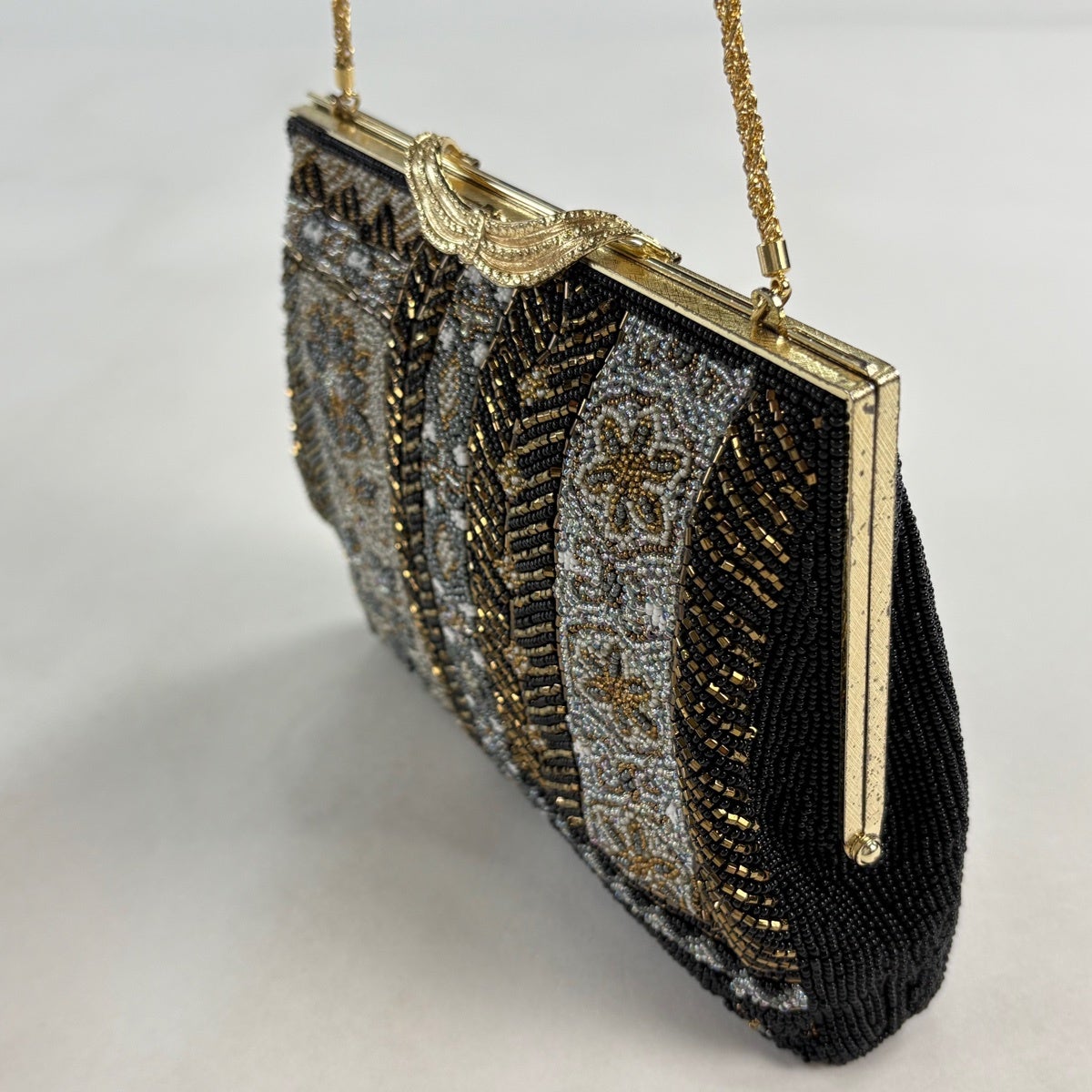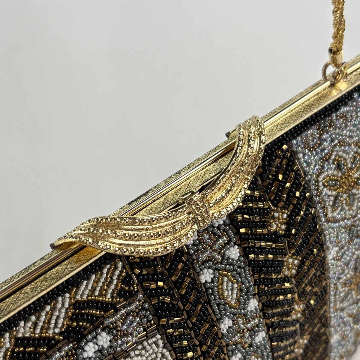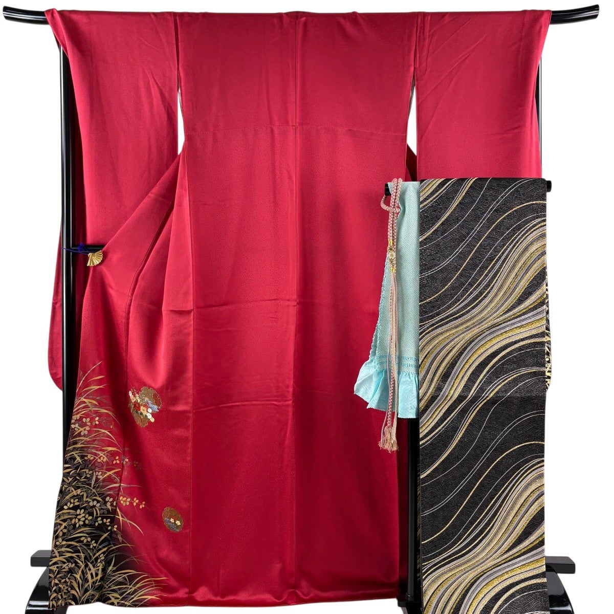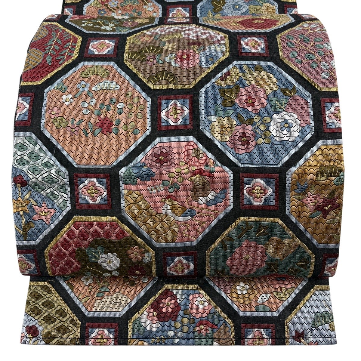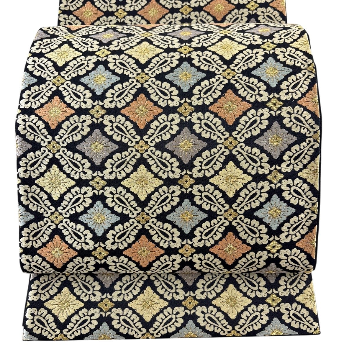 【美品】 袋帯 名品 七宝花菱文様 金糸 箔 黒 六通 正絹